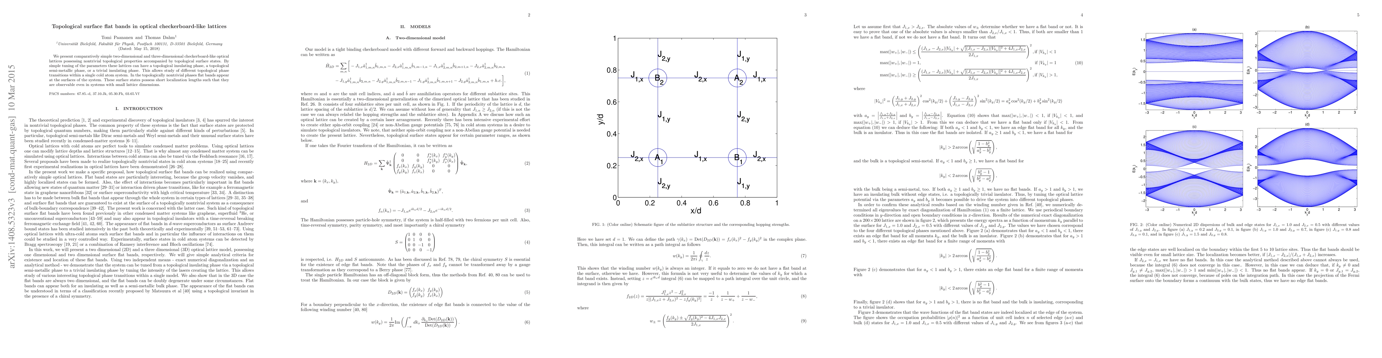 This paper explores two-dimensional and three-dimensional optical lattices with checkerboard patterns that exhibit nontrivial topological properties, allowing for transitions between topological insulating, semi-metallic, and trivial insulating phases. The study highlights the appearance of observable flat bands at the system's surfaces in topologically nontrivial phases.
