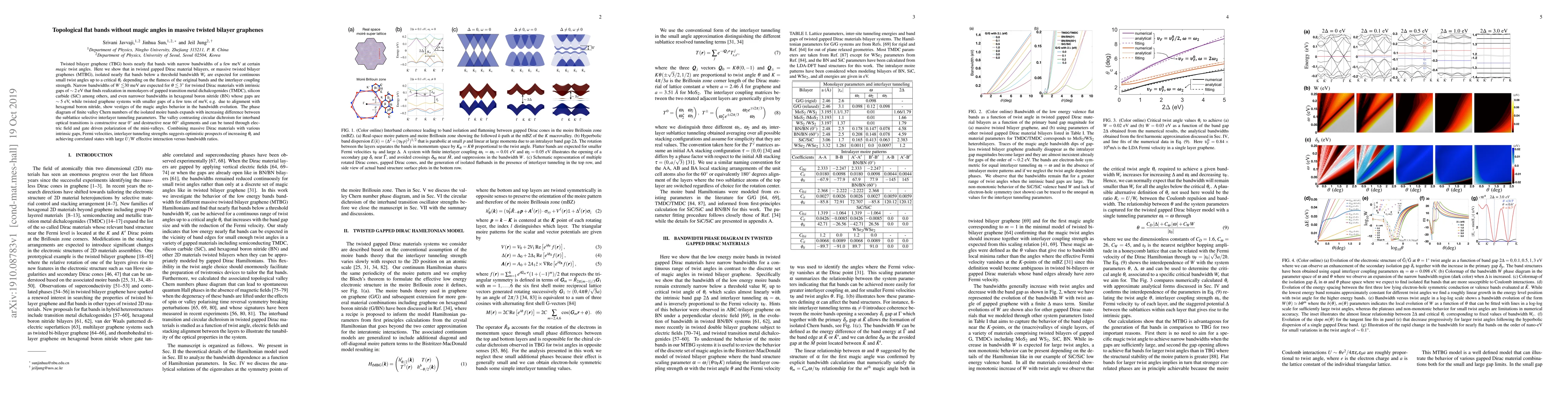 This paper demonstrates that massive twisted bilayer graphenes (MTBG) can host topologically flat bands without reliance on magic angles, with bandwidths up to 30 meV for small twist angles. The study highlights potential for achieving large effective interaction ratios in various materials with different intrinsic gaps.