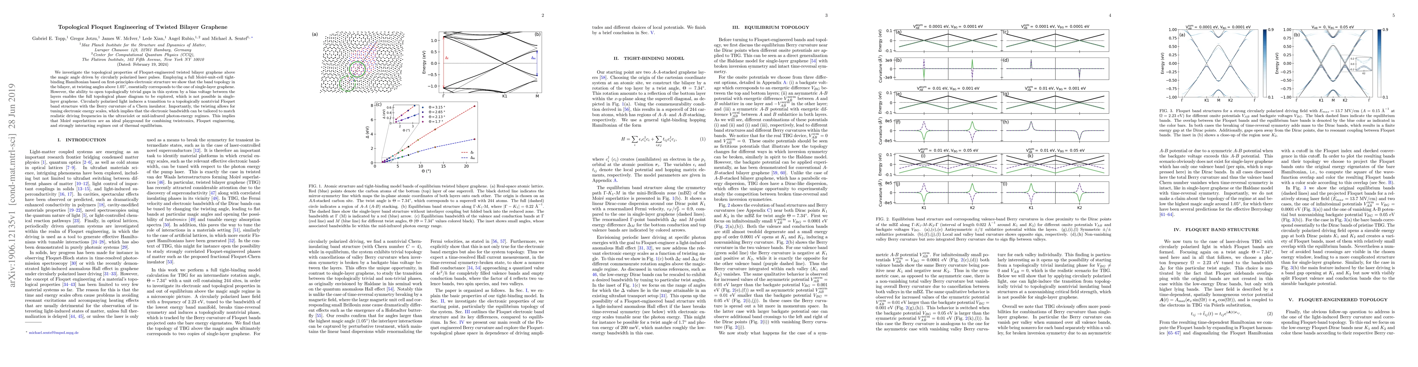 We investigate the topological properties of Floquet-engineered twisted bilayer graphene above the magic angle driven by circularly polarized laser pulses. Employing a full Moir\'e-unit-cell tight-binding Hamiltonian based on first-principles electronic structure we show that the band topology in the bilayer, at twisting angles above 1.05$^\circ$, essentially corresponds to the one of single-layer graphene. However, the ability to open topologically trivial gaps in this system by a bias voltage between the layers enables the full topological phase diagram to be explored, which is not possible in single-layer graphene. Circularly polarized light induces a transition to a topologically nontrivial Floquet band structure with the Berry curvature of a Chern insulator. Importantly, the twisting allows for tuning electronic energy scales, which implies that the electronic bandwidth can be tailored to match realistic driving frequencies in the ultraviolet or mid-infrared photon-energy regimes. This implies that Moir\'e superlattices are an ideal playground for combining twistronics, Floquet engineering, and strongly interacting regimes out of thermal equilibrium.