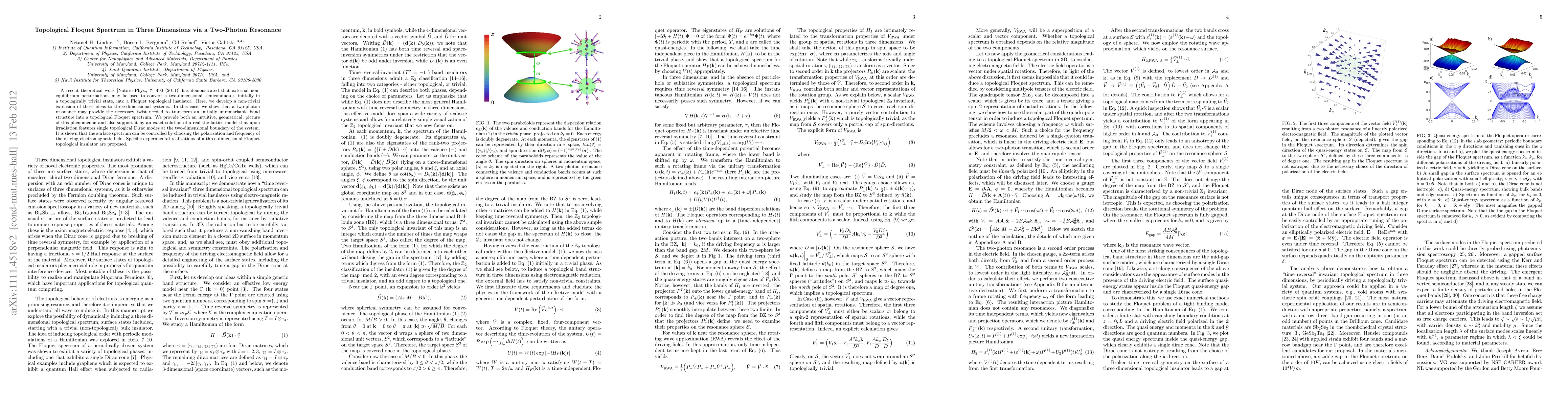This paper extends the concept of topological Floquet insulators to three dimensions using a two-photon resonance, transforming an initially trivial band structure into a topologically non-trivial state. The surface spectrum of this new three-dimensional Floquet topological insulator can be manipulated by adjusting the polarization and frequency of the driving electromagnetic field.