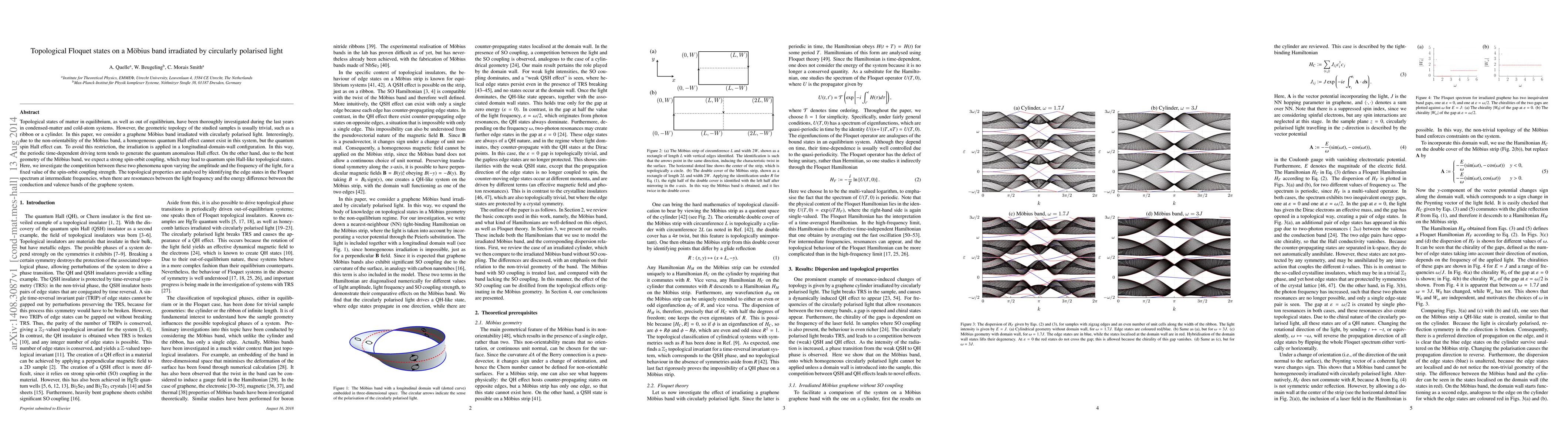 Topological states of matter in equilibrium, as well as out of equilibrium, have been thoroughly investigated during the last years in condensed-matter and cold-atom systems. However, the geometric topology of the studied samples is usually trivial, such as a ribbon or a cylinder. In this paper, we consider a graphene M\"obius band irradiated with circularly polarised light. Interestingly, due to the non-orientability of the M\"obius band, a homogeneous quantum Hall effect cannot exist in this system, but the quantum spin Hall effect can. To avoid this restriction, the irradiation is applied in a longitudinal-domain-wall configuration. In this way, the periodic time-dependent driving term tends to generate the quantum anomalous Hall effect. On the other hand, due to the bent geometry of the M\"obius band, we expect a strong spin-orbit coupling, which may lead to quantum spin Hall-like topological states. Here, we investigate the competition between these two phenomena upon varying the amplitude and the frequency of the light, for a fixed value of the spin-orbit coupling strength. The topological properties are analysed by identifying the edge states in the Floquet spectrum at intermediate frequencies, when there are resonances between the light frequency and the energy difference between the conduction and valence bands of the graphene system.