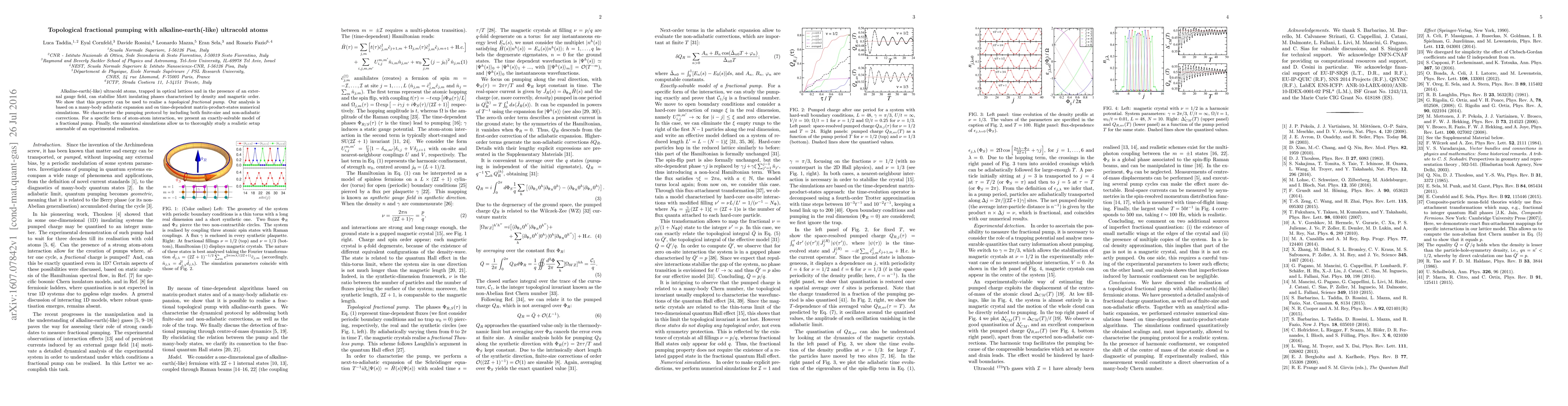This paper demonstrates the realization of topological fractional pumping using alkaline-earth(-like) ultracold atoms in optical lattices with an external gauge field. The authors employ many-body adiabatic expansion and time-dependent matrix-product-states simulations to characterize the pumping protocol, including finite-size and non-adiabatic corrections, and present an exactly-solvable model for a specific interaction.