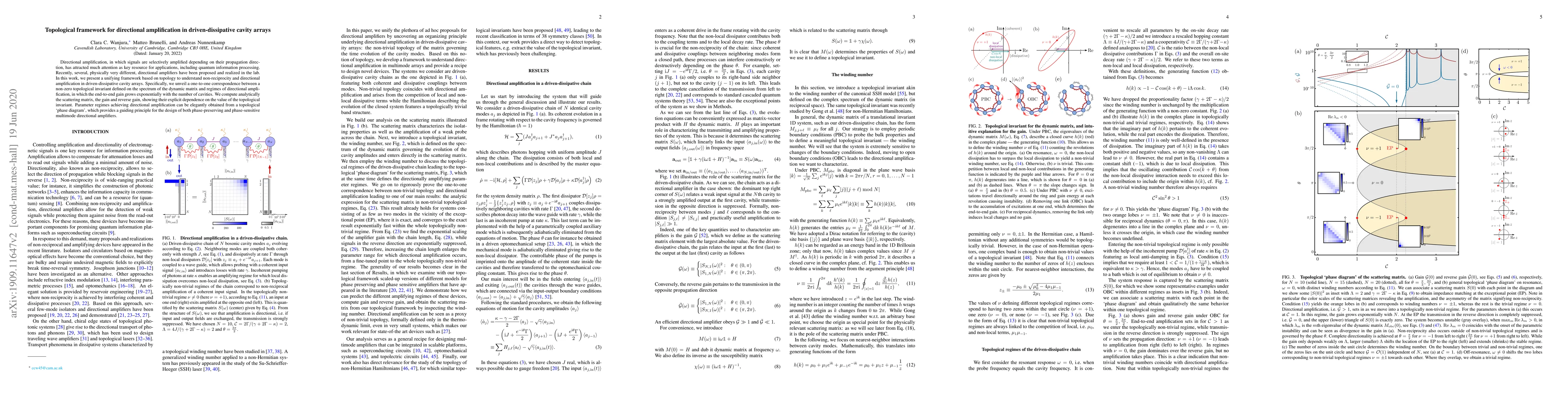 This paper presents a topological framework to understand directional amplification in driven-dissipative cavity arrays, revealing a direct link between a non-zero topological invariant and regimes of exponential end-to-end gain growth. The study provides a topological phase diagram to guide the design of multimode directional amplifiers.