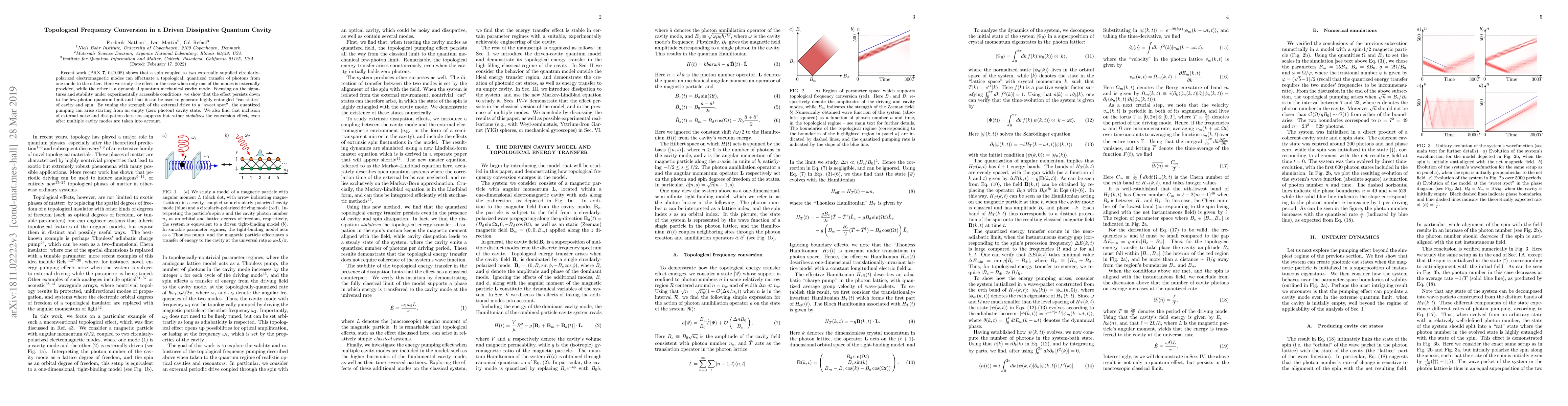 Recent work (PRX 7, 041008) has shown that a spin coupled to two externally supplied circularly-polarized electromagnetic modes can effectuate a topological, quantized transfer of photons from one mode to the other. Here we study the effect in the case when only one of the modes is externally provided, while the other is a dynamical quantum mechanical cavity mode. Focusing on the signatures and stability under experimentally accessible conditions, we show that the effect persists down to the few-photon quantum limit and that it can be used to generate highly entangled "cat states" of cavity and spin. By tuning the strength of the external drive to a "sweet spot", the quantized pumping can arise starting from an empty (zero photon) cavity state. We also find that inclusion of external noise and dissipation does not suppress but rather stabilizes the conversion effect, even after multiple cavity modes are taken into account.