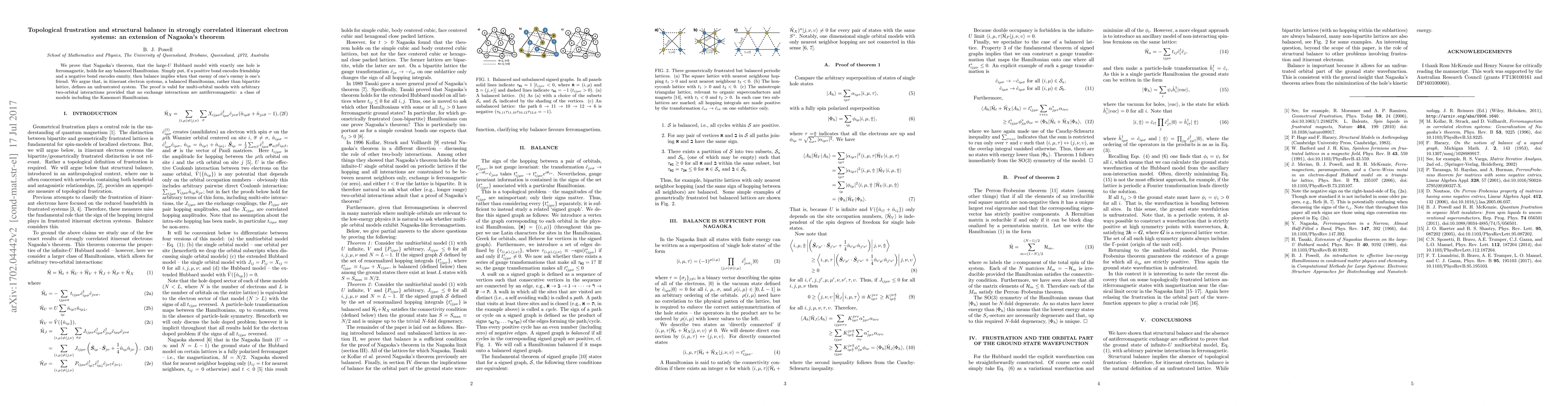 We prove that Nagaoka's theorem, that the large-$U$ Hubbard model with exactly one hole is ferromagnetic, holds for any balanced Hamiltonian. Simply put, if a positive bond encodes friendship and a negative bond encodes enmity, then balance implies when that enemy of one's enemy is one's friend. We argue that, in itinerant electron systems, a balanced Hamiltonian, rather than bipartite lattice, defines an unfrustrated system. The proof is valid for multi-orbital models with arbitrary two-orbital interactions provided that no exchange interactions are antiferromagnetic: a class of models including the Kanomori Hamiltonian.