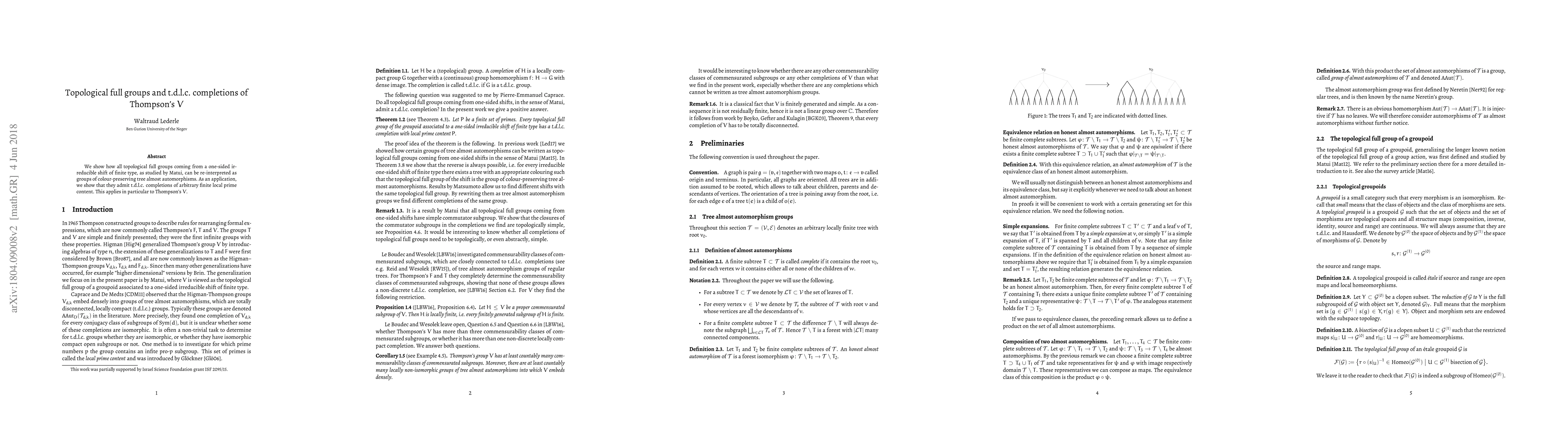 We show how all topological full groups coming from a one-sided irreducible shift of finite type, as studied by Matui, can be re-interpreted as groups of colour-preserving tree almost automorphisms. As an application, we show that they admit t.d.l.c. completions of arbitrary finite local prime content. This applies in particular to Thompson's $V$.