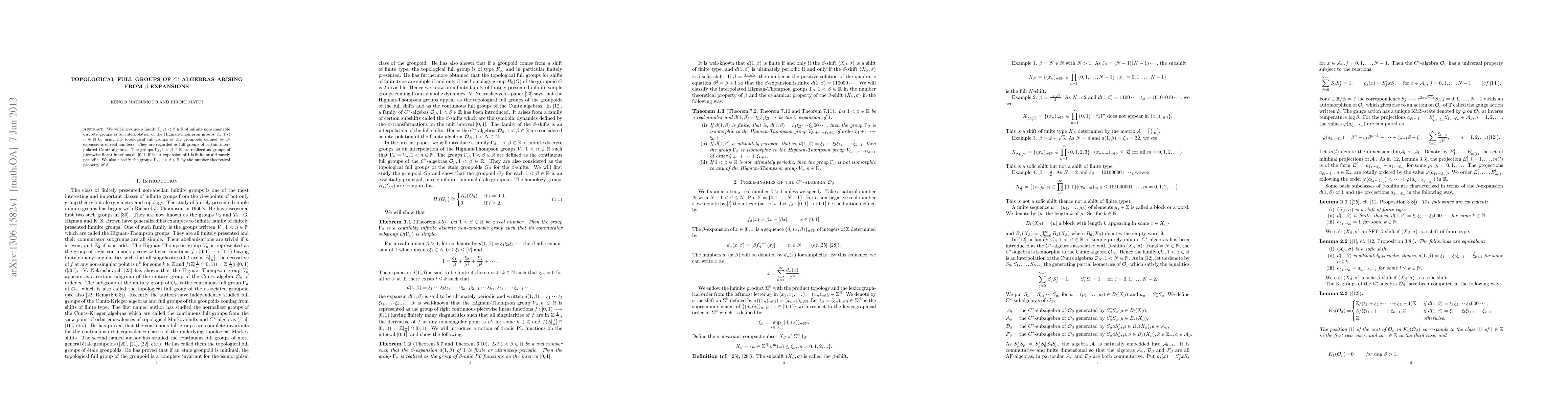 We will introduce a family $\Gamma_\beta, 1 < \beta \in {\mathbb{R}}$ of infinite non-amenable discrete groups as an interpolation of the Higman-Thompson groups $V_n, 1 < n \in {\mathbb{N}}$ by using the topological full groups of the groupoids defined by $\beta$-expansions of real numbers. They are regarded as full groups of certain interpolated Cuntz algebras. The groups $\Gamma_\beta, 1 < \beta \in {\mathbb{R}}$ are realized as groups of piecewise linear functions on $[0,1]$ if the $\beta$-expansion of $1$ is finite or ultimately periodic. We also classify the groups $\Gamma_\beta, 1 < \beta \in {\mathbb{R}}$ by the number theoretical property of $\beta$.