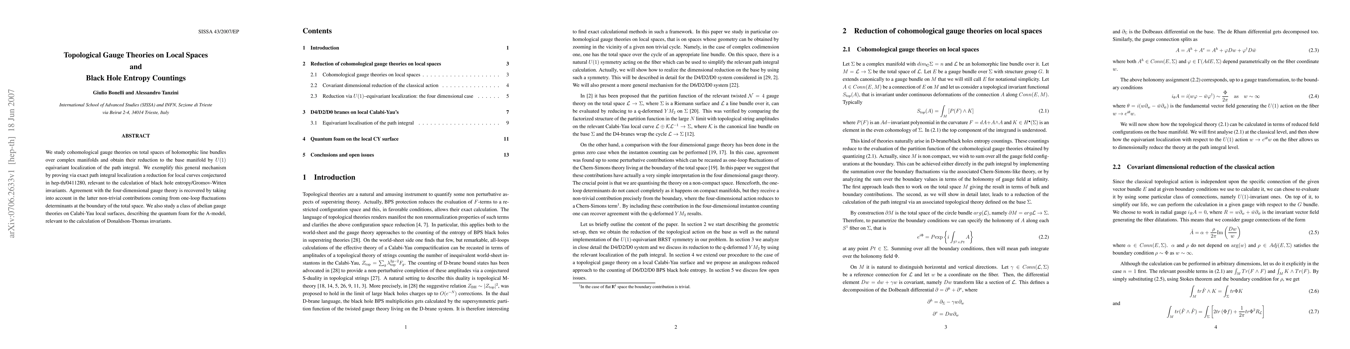 We study cohomological gauge theories on total spaces of holomorphic line bundles over complex manifolds and obtain their reduction to the base manifold by U(1) equivariant localization of the path integral. We exemplify this general mechanism by proving via exact path integral localization a reduction for local curves conjectured in hep-th/0411280, relevant to the calculation of black hole entropy/Gromov-Witten invariants. Agreement with the four-dimensional gauge theory is recovered by taking into account in the latter non-trivial contributions coming from one-loop fluctuations determinants at the boundary of the total space. We also study a class of abelian gauge theories on Calabi-Yau local surfaces, describing the quantum foam for the A-model, relevant to the calculation of Donaldson-Thomas invariants.