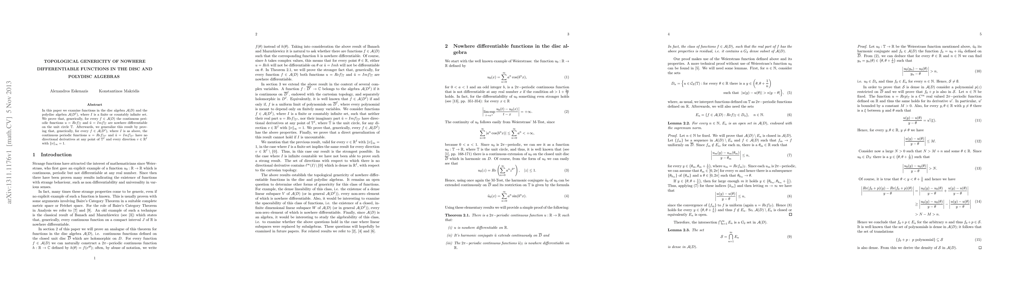 This paper demonstrates the topological genericity of nowhere differentiable functions in disc and polydisc algebras, proving that continuous periodic functions derived from the real and imaginary parts of functions in these algebras are generically nowhere differentiable on the unit circle and lack directional derivatives in higher dimensions.