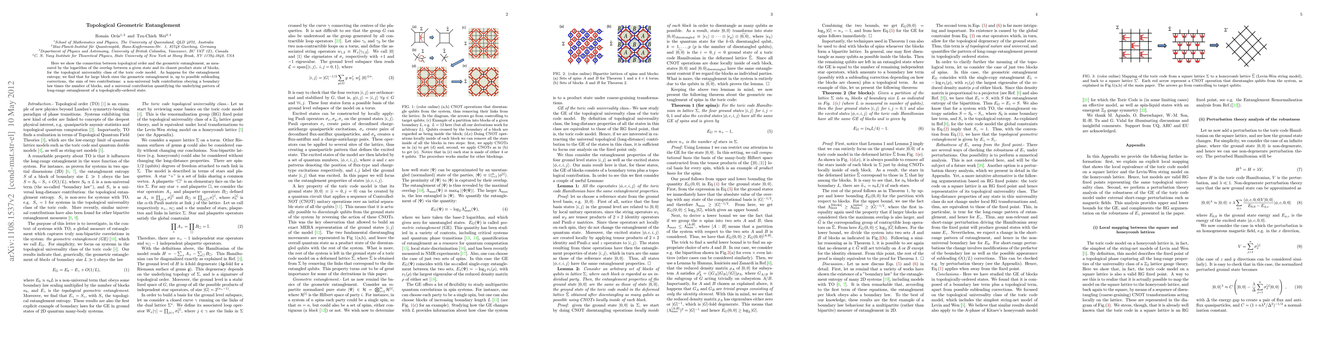 This paper establishes a link between topological order and geometric entanglement in the toric code model, revealing that large block sizes yield geometric entanglement composed of a bulk contribution and a universal term reflecting long-range entanglement patterns.