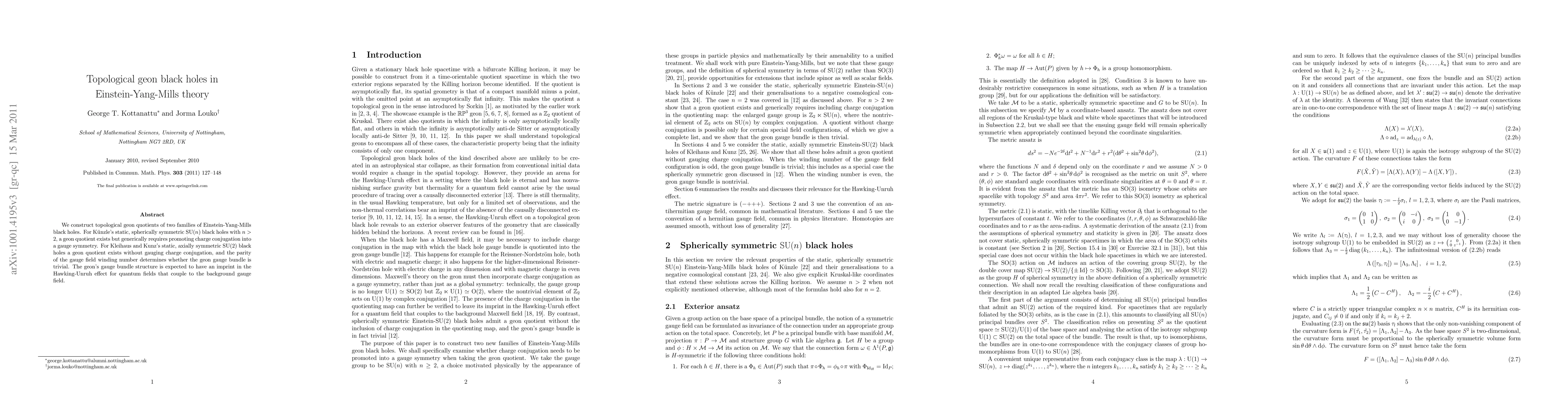 Summary: This paper constructs topological geon quotients of two types of Einstein-Yang-Mills black holes, demonstrating that geon existence varies with gauge symmetry promotion and the winding number parity influences the geon's gauge bundle structure, which may affect the Hawking-Unruh effect.