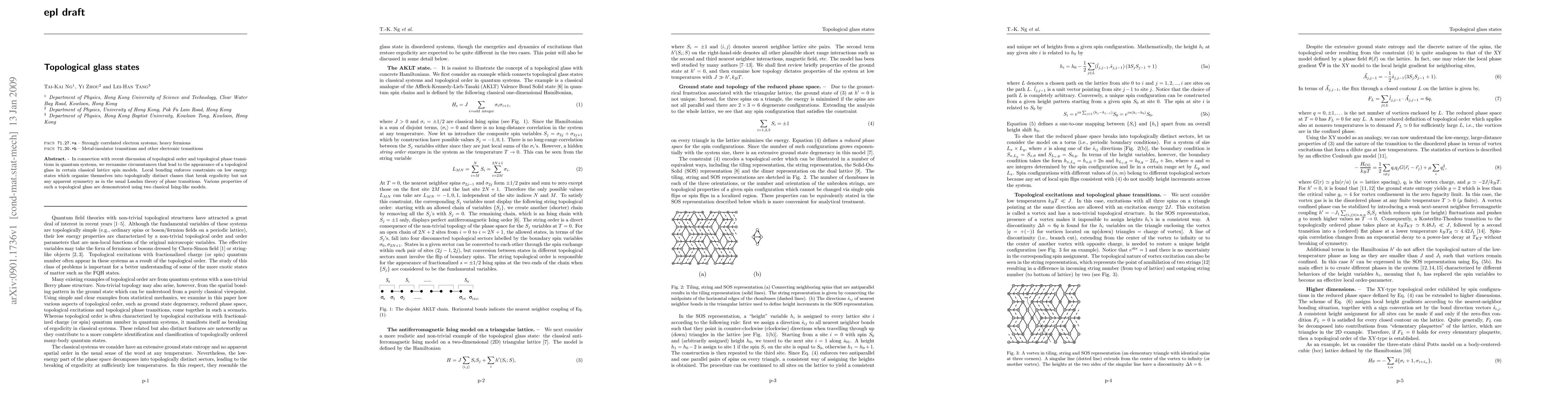 In connection with recent discussion of topological order and topological phase transitions in quantum systems, we reexamine circumstances that lead to the appearance of a topological glass in certain classical lattice spin models. Local bonding enforces constraints on low energy states which organize themselves into topologically distinct classes that break ergodicity but not any apparent symmetry as in the usual Landau theory of phase transitions. Various properties of such a topological glass are demonstrated using two classical Ising-like models.