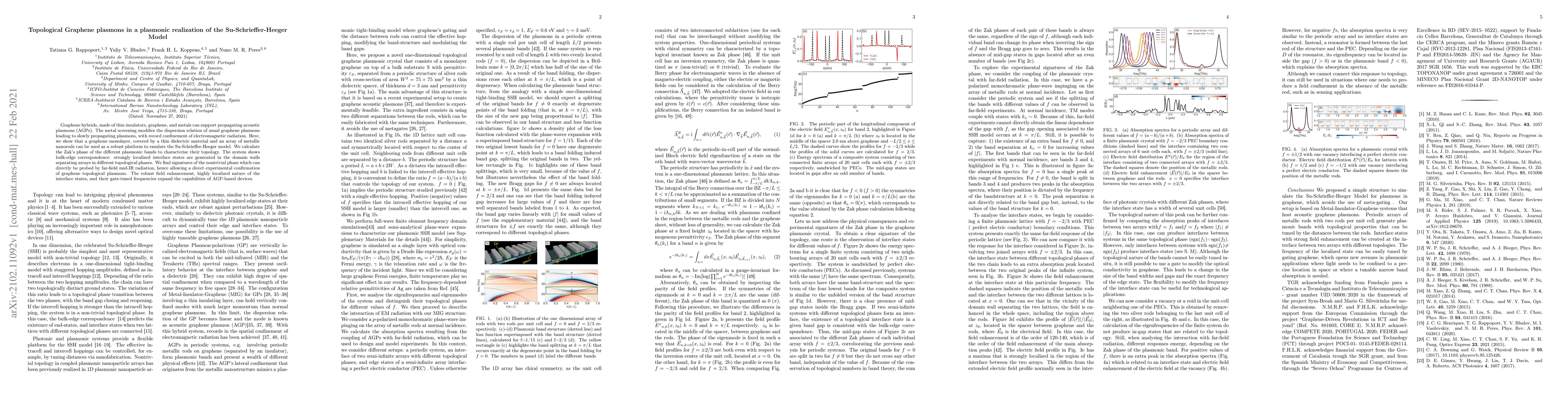 This paper demonstrates a graphene monolayer hybridized with metallic nanorods and dielectric layers to emulate the Su-Schrieffer-Heeger model, showing topological plasmons with localized interface states and robust electromagnetic field enhancement, which can be probed experimentally. The topological nature of these plasmons is characterized by calculating the Zak's phase and observing bulk-edge correspondence.