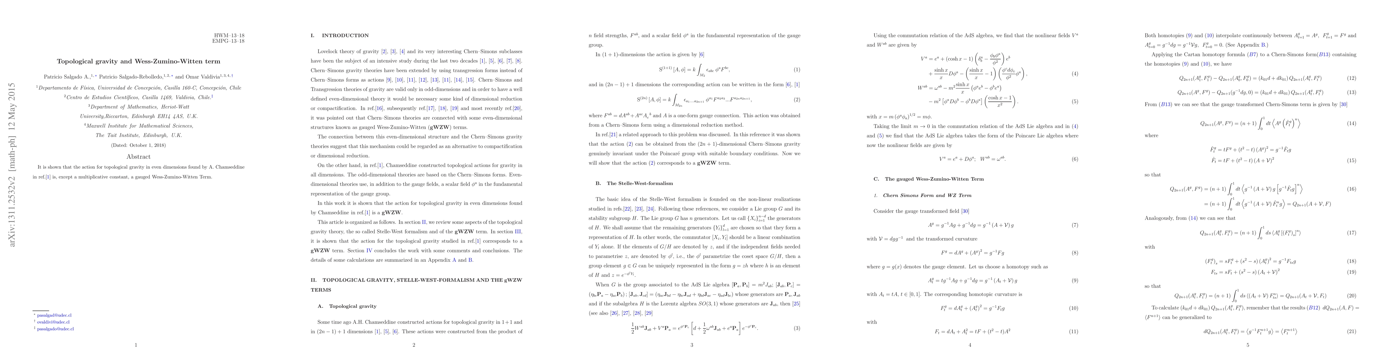 The research demonstrates that the action for topological gravity in even dimensions corresponds, up to a multiplicative constant, to a gauged Wess-Zumino-Witten (WZW) term.