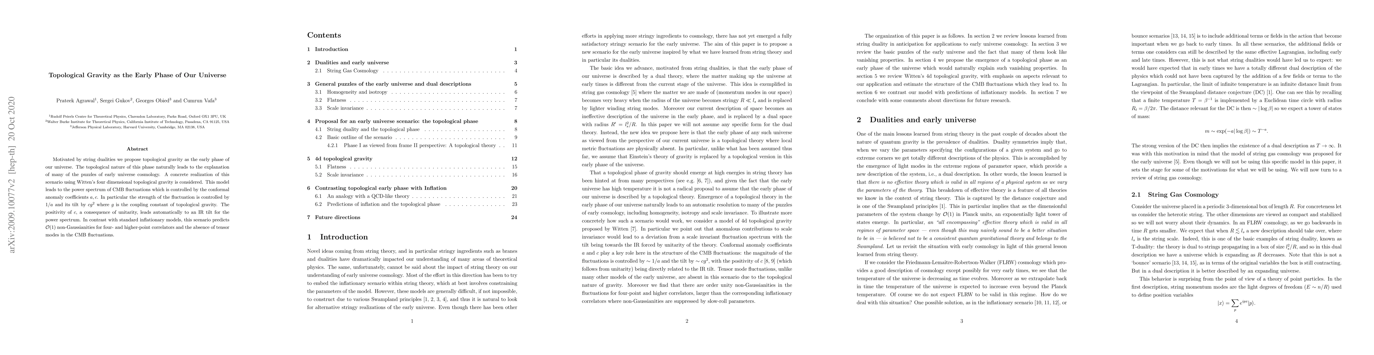 Motivated by string dualities we propose topological gravity as the early phase of our universe. The topological nature of this phase naturally leads to the explanation of many of the puzzles of early universe cosmology. A concrete realization of this scenario using Witten's four dimensional topological gravity is considered. This model leads to the power spectrum of CMB fluctuations which is controlled by the conformal anomaly coefficients $a,c$. In particular the strength of the fluctuation is controlled by $1/a$ and its tilt by $c g^2$ where $g$ is the coupling constant of topological gravity. The positivity of $c$, a consequence of unitarity, leads automatically to an IR tilt for the power spectrum. In contrast with standard inflationary models, this scenario predicts $\mathcal{O}(1)$ non-Gaussianities for four- and higher-point correlators and the absence of tensor modes in the CMB fluctuations.
