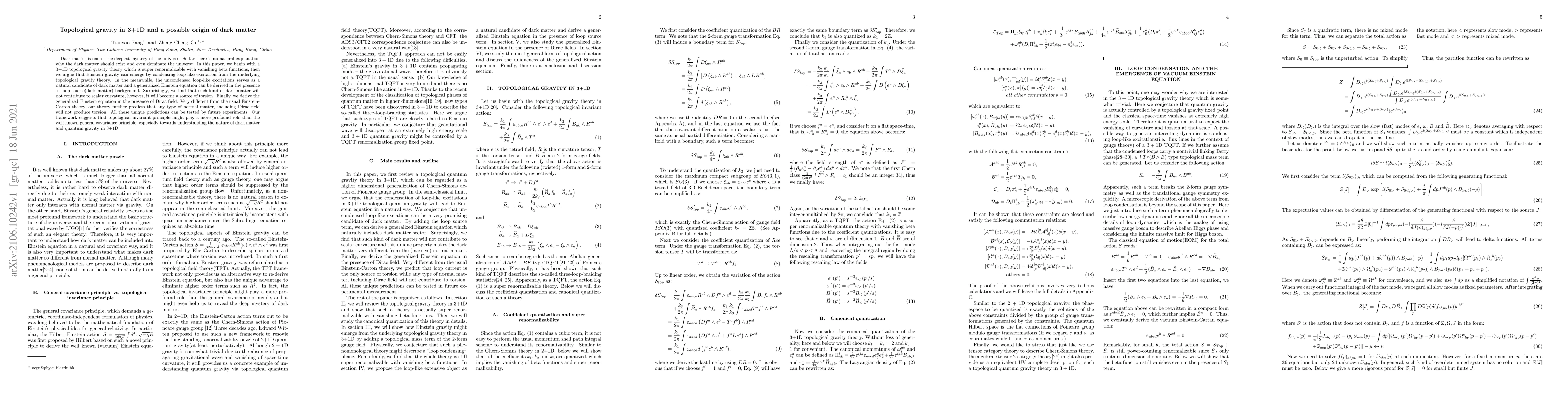 Dark matter is one of the deepest mystery of the universe. So far there is no natural explanation why the dark matter should exist and even dominate the universe. In this paper, we begin with a 3+1D topological gravity theory which is super renormalizable with vanishing beta functions, then we argue that Einstein gravity can emerge by condensing loop-like excitation from the underlying topological gravity theory. In the meanwhile, the uncondensed loop-like excitations serves as a natural candidate of dark matter and a generalized Einstein equation can be derived in the presence of loop-source(dark matter) background. Surprisingly, we find that such kind of dark matter will not contribute to scalar curvature, however, it will become a source of torsion. Finally, we derive the generalized Einstein equation in the presence of Dirac field. Very different from the usual Einstein-Carton theory, our theory further predicts that any type of normal matter, including Dirac field will not produce torsion. All these unique predictions can be tested by future experiments. Our framework suggests that topological invariant principle might play a more profound role than the well-known general covariance principle, especially towards understanding the nature of dark matter and quantum gravity in 3+1D.