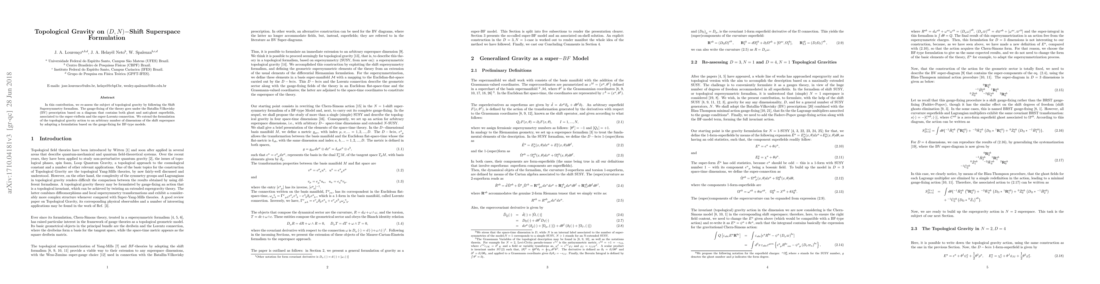 In this contribution, we re-assess the subject of topological gravity by following the Shift Supersymmetry formalism. The gauge-fixing of the theory goes under the Batallin-Vilkovisky (BV) prescription based on a diagram that contains both ghost and anti-ghost superfields, associated to the super-vielbein and the super-Lorentz connection. We extend the formulation of the topological gravity action to an arbitrary number of dimensions of the shift superspace by adopting a formulation based on the gauge-fixing for BF-type models.