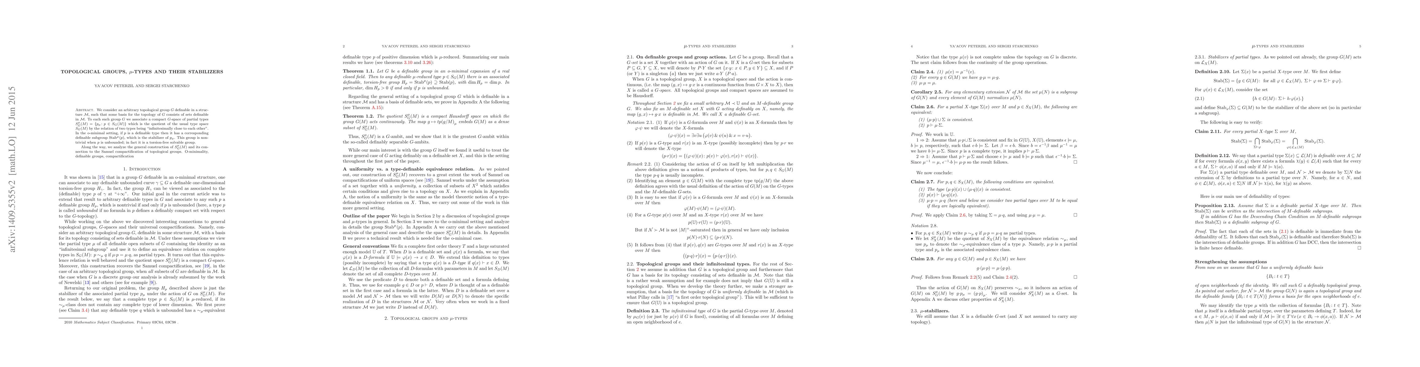 We consider an arbitrary topological group $G$ definable in a structure $\mathcal M$, such that some basis for the topology of $G$ consists of sets definable in $\mathcal M$. To each such group $G$ we associate a compact $G$-space of partial types $S^\mu_G(M)=\{p_\mu:p\in S_G(M)\}$ which is the quotient of the usual type space $S_G(M)$ by the relation of two types being "infinitesimally close to each other". In the o-minimal setting, if $p$ is a definable type then it has a corresponding definable subgroup $Stab_\mu(p)$, which is the stabilizer of $p_\mu$. This group is nontrivial when $p$ is unbounded in the sense of $\mathcal M$; in fact it is a torsion-free solvable group. Along the way, we analyze the general construction of $S^\mu_G(M)$ and its connection to the Samuel compactification of topological groups.