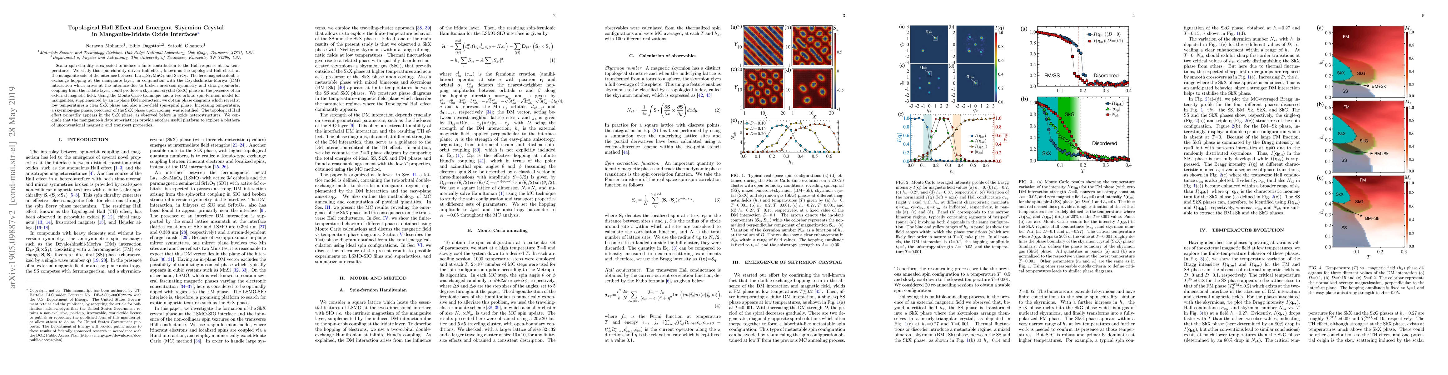 This study investigates the topological Hall effect and emergent skyrmion crystal phases at the interface between La$_{1-x}$Sr$_{x}$MnO$_{3}$ and SrIrO$_3$. The research reveals a skyrmion-crystal phase driven by spin chirality and Dzyaloshinskii-Moriya interaction, with the topological Hall effect manifesting prominently in this phase.
