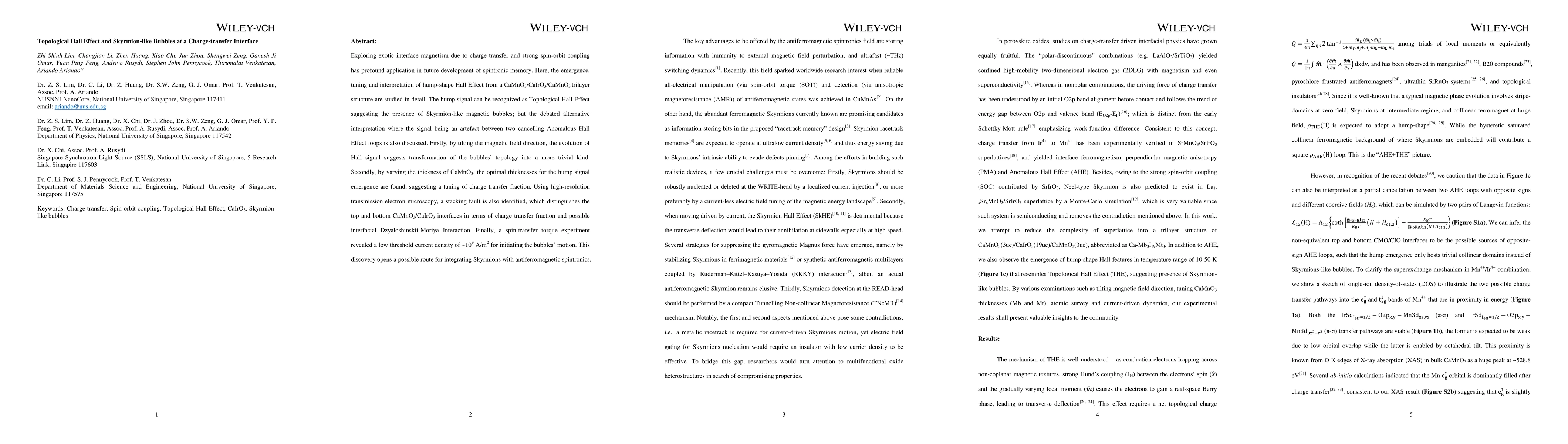 Exploring exotic interface magnetism due to charge transfer and strong spin-orbit coupling has profound application in future development of spintronic memory. Here, the emergence, tuning and interpretation of hump-shape Hall Effect from a CaMnO3/CaIrO3/CaMnO3 trilayer structure are studied in detail. The hump signal can be recognized as Topological Hall Effect suggesting the presence of Skyrmion-like magnetic bubbles; but the debated alternative interpretation where the signal being an artefact between two cancelling Anomalous Hall Effect loops is also discussed. Firstly, by tilting the magnetic field direction, the evolution of Hall signal suggests transformation of the bubbles topology into a more trivial kind. Secondly, by varying the thickness of CaMnO3, the optimal thicknesses for the hump signal emergence are found, suggesting a tuning of charge transfer fraction. Using high-resolution transmission electron microscopy, a stacking fault is also identified, which distinguishes the top and bottom CaMnO3/CaIrO3 interfaces in terms of charge transfer fraction and possible interfacial Dzyaloshinskii-Moriya Interaction. Finally, a spin-transfer torque experiment revealed a low threshold current density of ~10^9 A/m^2 for initiating the motion of bubbles. This discovery opens a possible route for integrating Skyrmions with antiferromagnetic spintronics.