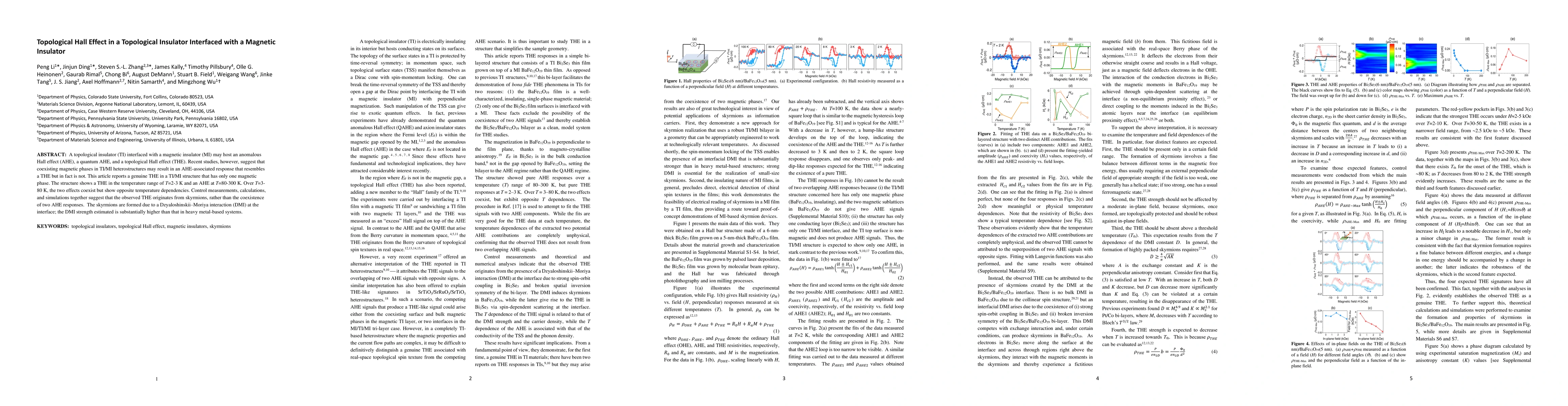 A topological insulator (TI) interfaced with a magnetic insulator (MI) may host an anomalous Hall effect (AHE), a quantum AHE, and a topological Hall effect (THE). Recent studies, however, suggest that coexisting magnetic phases in TI/MI heterostructures may result in an AHE-associated response that resembles a THE but in fact is not. This article reports a genuine THE in a TI/MI structure that has only one magnetic phase. The structure shows a THE in the temperature range of T=2-3 K and an AHE at T=80-300 K. Over T=3-80 K, the two effects coexist but show opposite temperature dependencies. Control measurements, calculations, and simulations together suggest that the observed THE originates from skyrmions, rather than the coexistence of two AHE responses. The skyrmions are formed due to an interfacial DMI interaction. The DMI strength estimated is substantially higher than that in heavy metal-based systems.