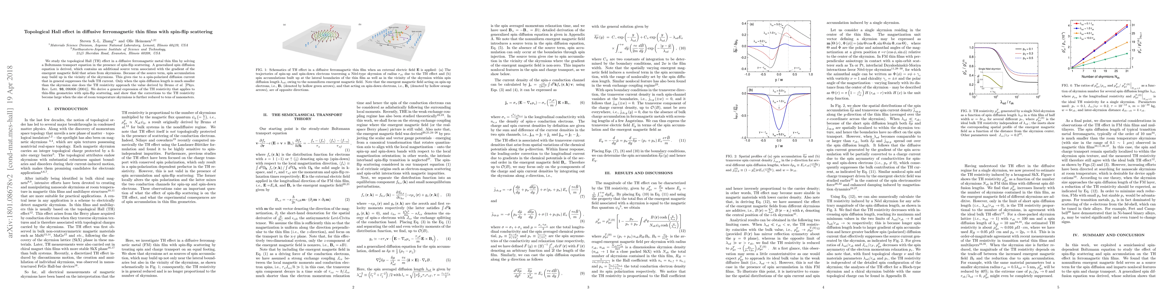This paper explores the topological Hall effect in ferromagnetic thin films with spin-flip scattering, deriving a generalized spin diffusion equation that reveals spin accumulation near magnetic skyrmions. It concludes that the topological Hall resistivity deviates from the original Bruno model unless the spin diffusion length is much smaller than the skyrmion size.