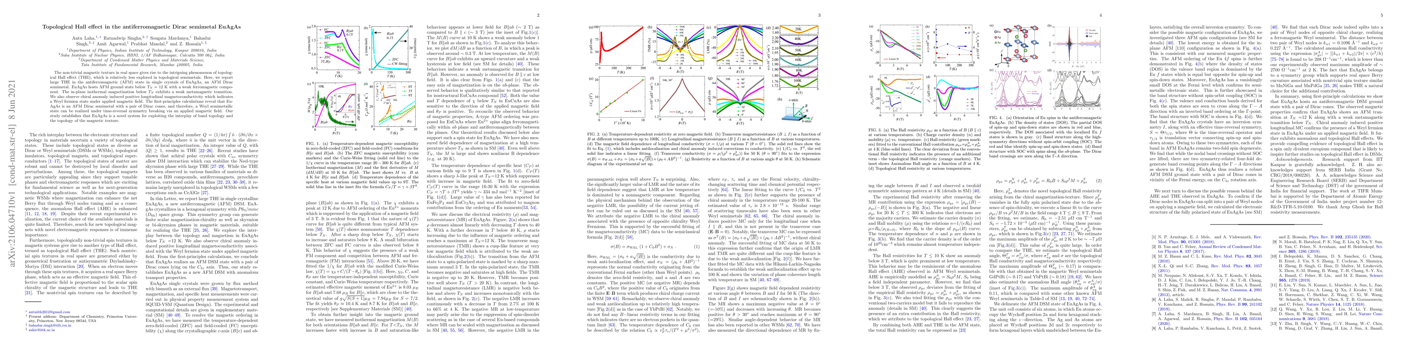 This study reports the observation of a large topological Hall effect in the antiferromagnetic Dirac semimetal EuAgAs, revealing its potential as a novel system for exploring the interplay between band topology and magnetic texture. The research also highlights the chiral anomaly and Weyl fermion states induced under an applied magnetic field.