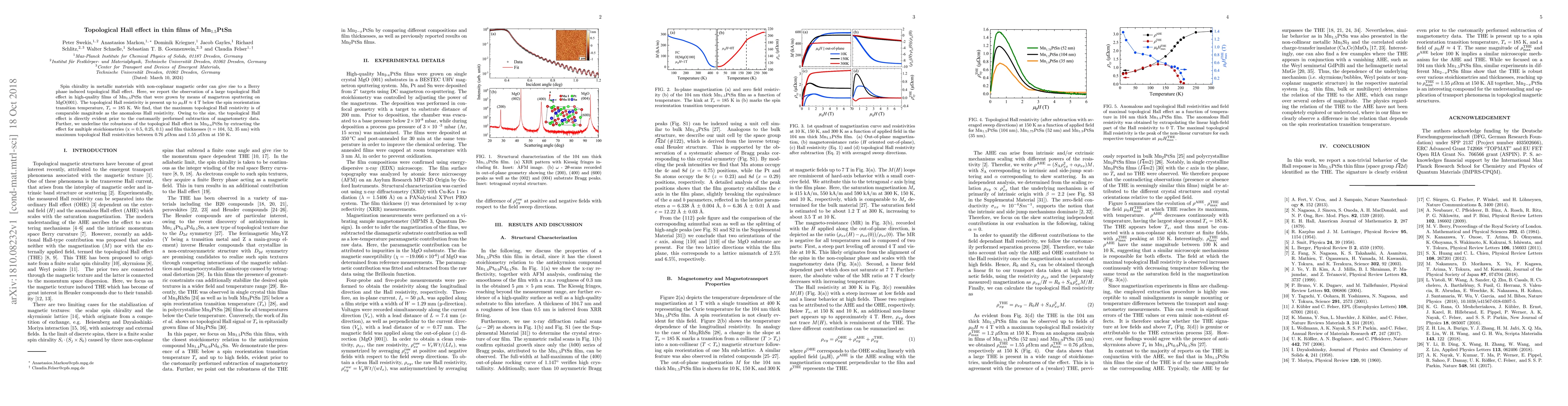 Researchers observed a large topological Hall effect in thin films of Mn1.5PtSn, finding comparable magnitude to anomalous Hall resistivity, with effects visible before subtraction of magnetometry data.