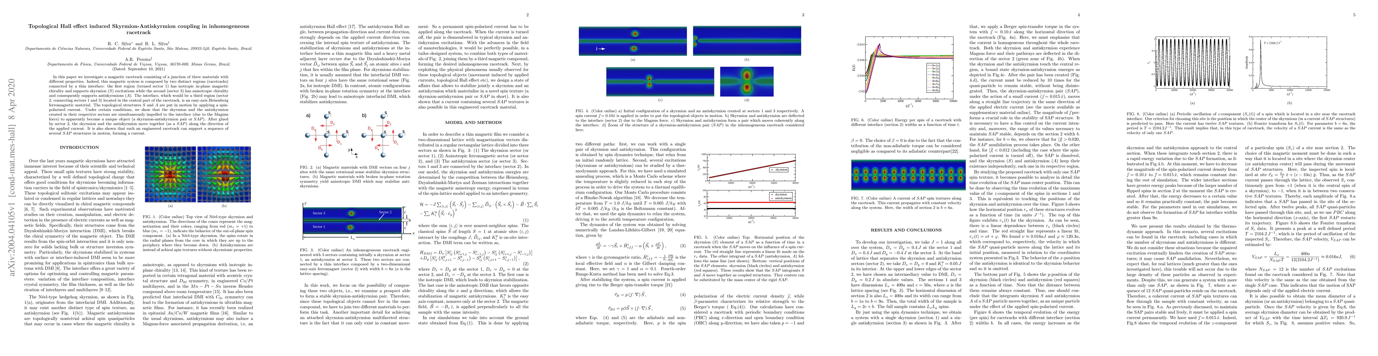 In this paper we investigate a magnetic racetrack consisting of a junction of three materials with different properties. Indeed, this magnetic system is composed by two distinct regions (racetracks) connected by a thin interface: the first region (termed sector $1$) has isotropic in-plane magnetic chirality and supports skyrmion ($S$) excitations while the second (sector $3$) has anisotropic chirality and consequently supports antiskyrmions ($A$). The interface, which would be a third region (sector $2$, connecting sectors $1$ and $3$) located in the central part of the racetrack, is an easy-axis Heisenberg ferromagnetic material. The topological structures $S$ and $A$ are put in motion by applying a spin-polarized current. Under certain conditions, we show that the skyrmion and the antiskyrmion created in their respective sectors are simultaneously impelled to the interface (due to the Magnus force) to apparently become a unique object (a skyrmion-antiskyrmion pair or $SAP$). After glued by sector $2$, the skyrmion and the antiskyrmion move together (as a $SAP$) along the direction of the applied current. It is also shown that such an engineered racetrack can support a sequence of several $SAP$ structures in motion, forming a current.