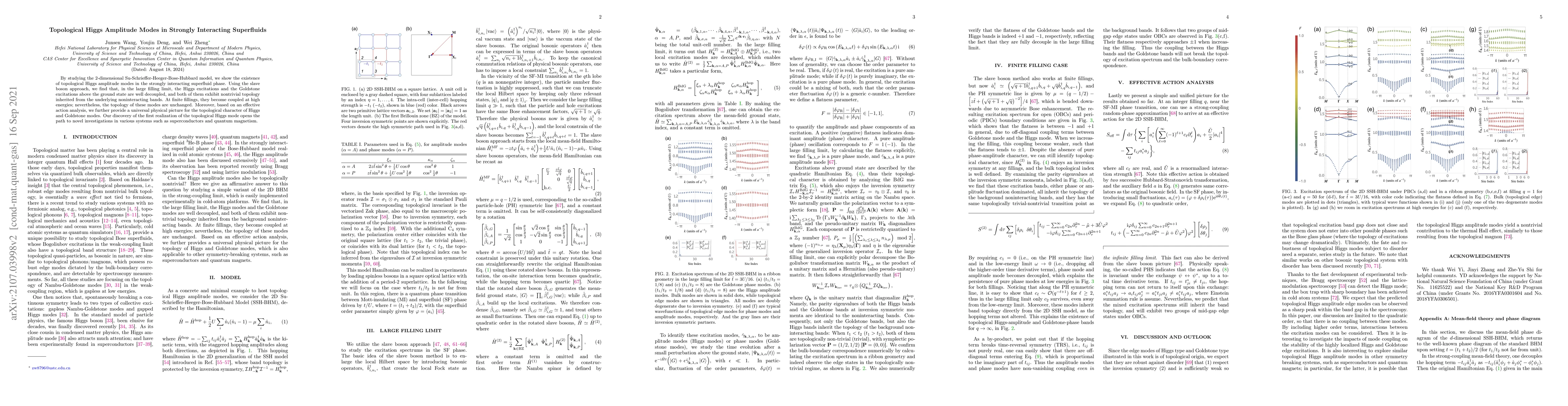 By studying the 2-dimensional Su-Schrieffer-Heeger-Bose-Hubbard model, we show the existence of topological Higgs amplitude modes in the strongly interacting superfluid phase. Using the slave boson approach, we find that, in the large filling limit, the Higgs excitations and the Goldstone excitations above the ground state are well decoupled, and both of them exhibit nontrivial topology inherited from the underlying noninteracting bands. At finite fillings, they become coupled at high energies; nevertheless, the topology of these modes are unchanged. Moreover, based on an effective action analysis, we further provide a universal physical picture for the topological character of Higgs and Goldstone modes. Our discovery of the first realization of the topological Higgs mode opens the path to novel investigations in various systems such as superconductors and quantum magnetism.