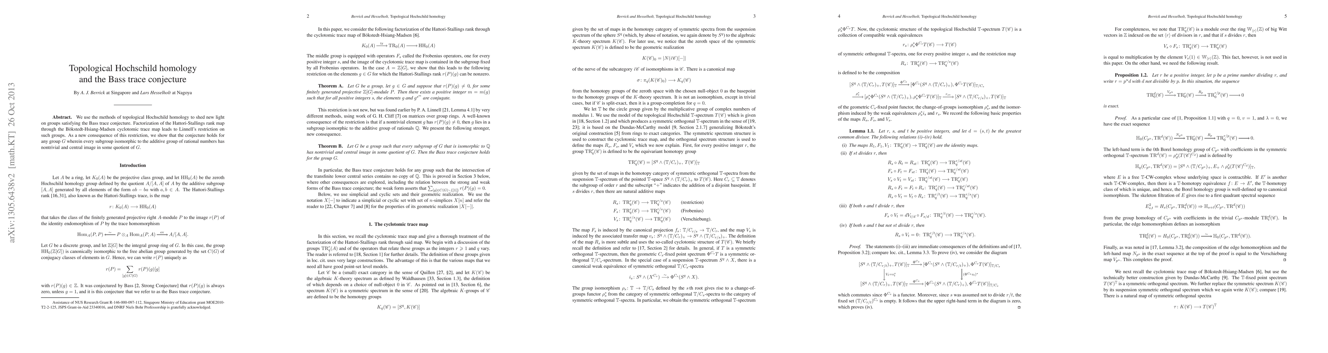 We use the methods of topological Hochschild homology to shed new light on the groups satisfying the Bass trace conjecture. We show that the factorization of the Hattori-Stallings rank map through the Bokstedt-Hsiang-Madsen cyclotomic trace map leads to Linnell's restriction on such groups. As a new consequence of this restriction, we show that the conjecture holds for any group G with the property that every subgroup that is isomorphic to the additive group of rational numbers has nontrivial and central image in some quotient of G.