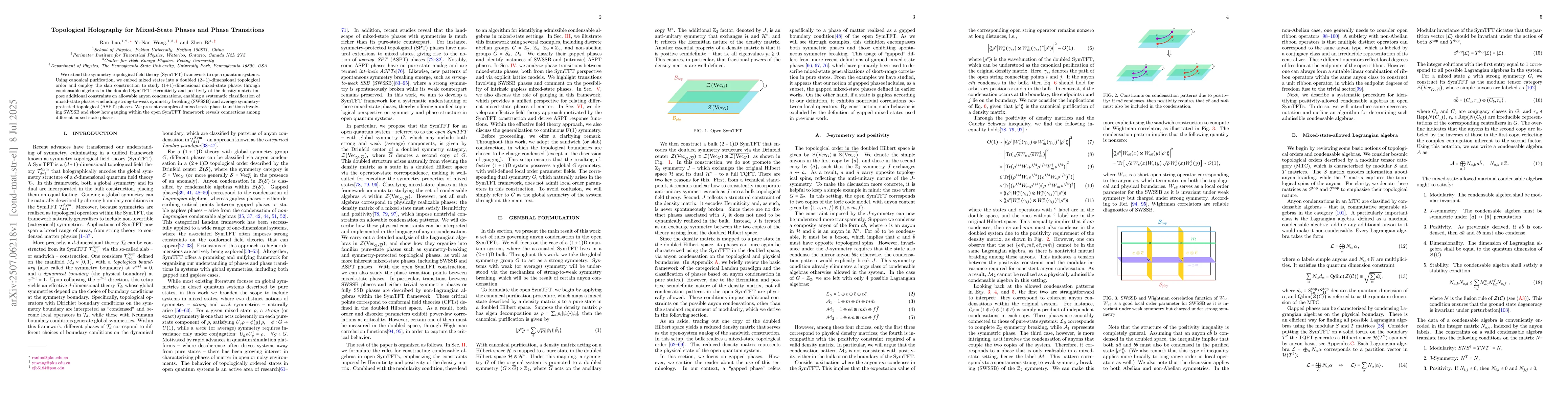 We extend the symmetry topological field theory (SymTFT) framework to open quantum systems. Using canonical purification, we embed mixed states into a doubled (2+1)-dimensional topological order and employ the slab construction to study (1+1)-dimensional mixed-state phases through condensable algebras in the doubled SymTFT. Hermiticity and positivity of the density matrix impose additional constraints on allowable anyon condensations, enabling a systematic classification of mixed-state phases - including strong-to-weak symmetry breaking (SWSSB) and average symmetry-protected topological (ASPT) phases. We present examples of mixed-state phase transitions involving SWSSB and show how gauging within the open SymTFT framework reveals connections among different mixed-state phases.