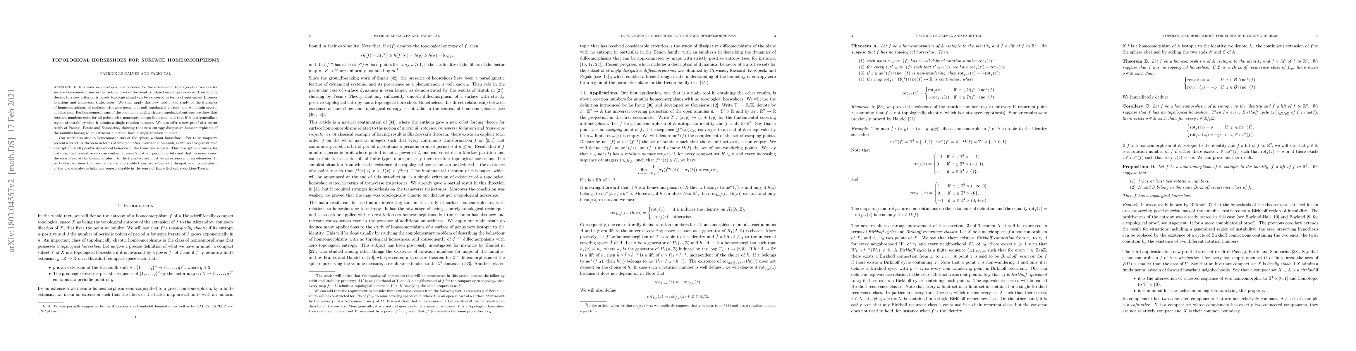 This paper introduces a new topological criterion for the existence of topological horseshoes in surface homeomorphisms, leveraging equivariant Brouwer foliations. It applies this criterion to study dynamics in homeomorphisms of surfaces with zero genus and null entropy, proving results on rotation numbers and providing a structure theorem for homeomorphisms of the sphere without horseshoes.