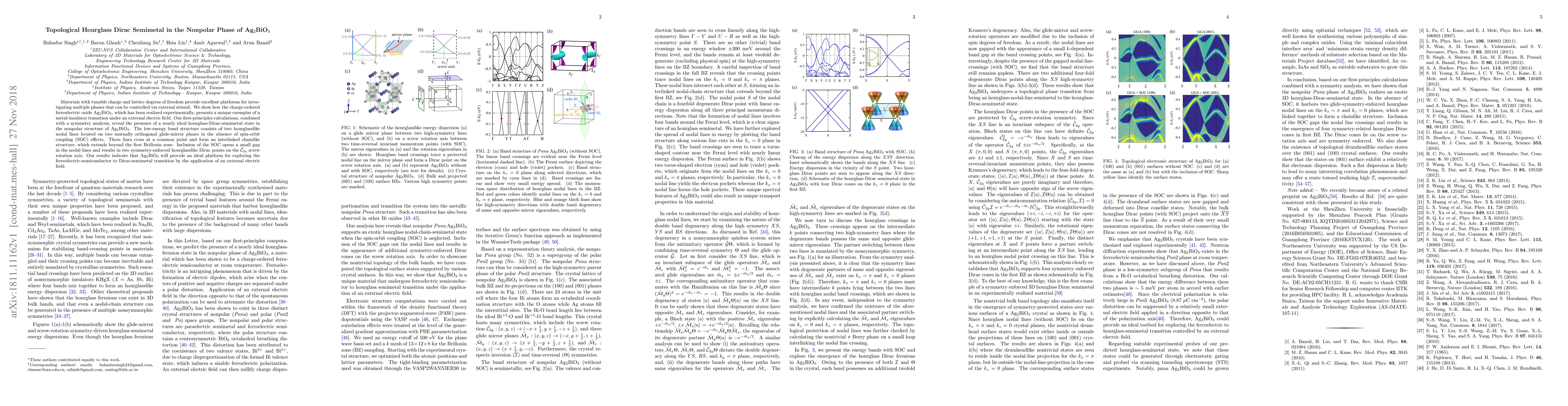 This paper demonstrates that Ag$_2$BiO$_3$ exhibits a topological hourglass Dirac semimetal state in its nonpolar phase, characterized by hourglass-shaped nodal lines in its band structure. The inclusion of spin-orbit coupling opens a small gap, leading to Dirac points, suggesting the material's potential for exploring transitions between ferroelectric-semiconductor and Dirac-semimetal states via external electric fields.