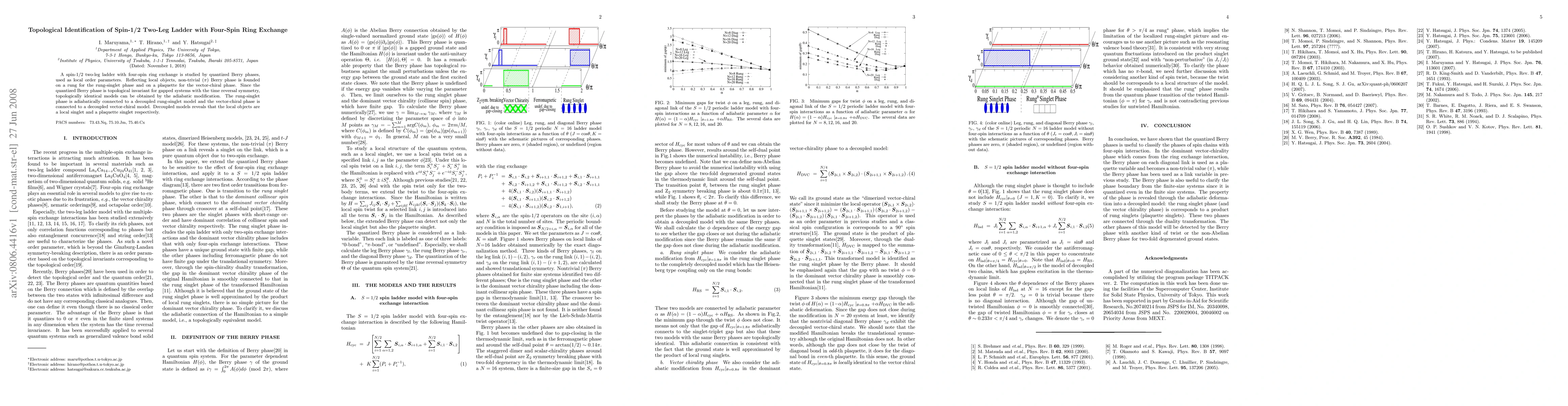 The paper identifies topological phases in a spin-1/2 two-leg ladder with four-spin ring exchange using quantized Berry phases. It finds non-trivial Berry phases ($\pi$) indicating distinct topological phases, showing that these phases are adiabatically connected to decoupled models revealing underlying local singlets.