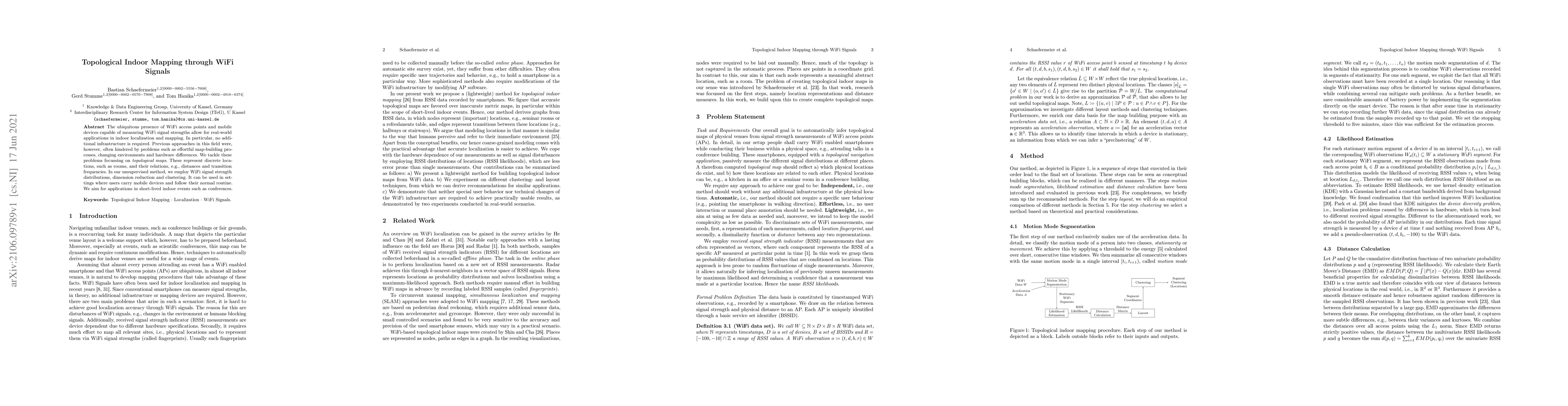 The ubiquitous presence of WiFi access points and mobile devices capable of measuring WiFi signal strengths allow for real-world applications in indoor localization and mapping. In particular, no additional infrastructure is required. Previous approaches in this field were, however, often hindered by problems such as effortful map-building processes, changing environments and hardware differences. We tackle these problems focussing on topological maps. These represent discrete locations, such as rooms, and their relations, e.g., distances and transition frequencies. In our unsupervised method, we employ WiFi signal strength distributions, dimension reduction and clustering. It can be used in settings where users carry mobile devices and follow their normal routine. We aim for applications in short-lived indoor events such as conferences.