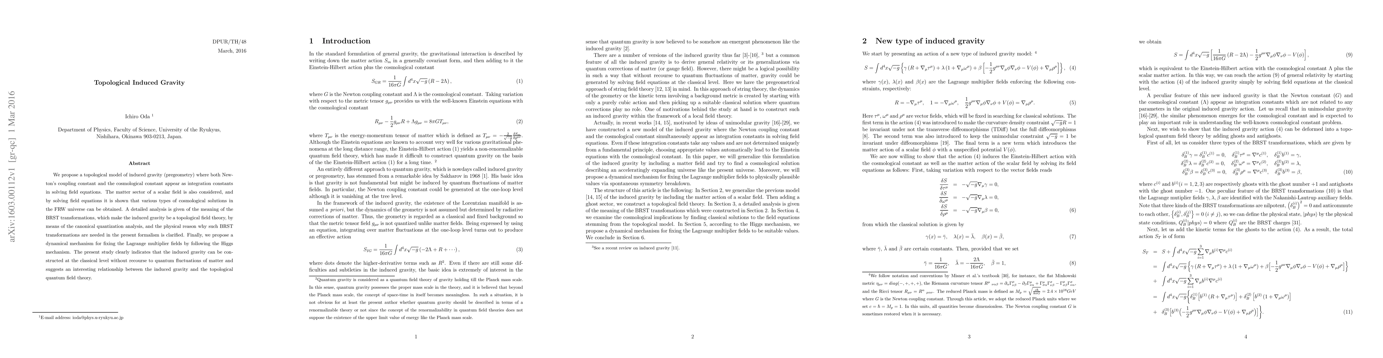 This paper proposes a topological model of induced gravity where Newton's coupling constant and the cosmological constant arise naturally from field equations. It also explores the scalar field matter sector and demonstrates various cosmological solutions in the FRW universe, emphasizing the role of BRST transformations in making induced gravity a topological field theory.
