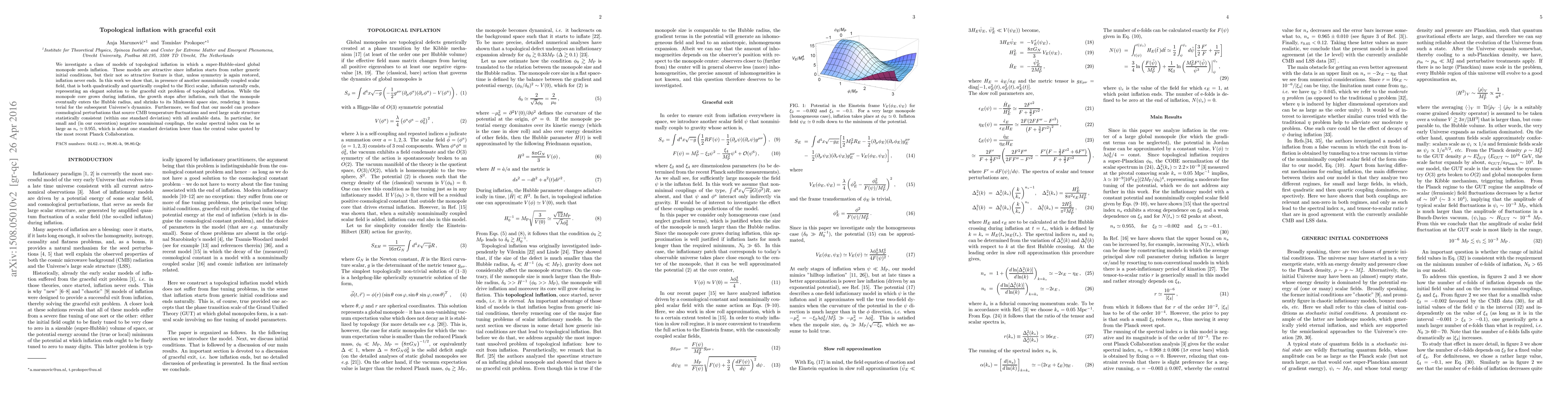 We investigate a class of models of topological inflation in which a super-Hubble-sized global monopole seeds inflation. These models are attractive since inflation starts from rather generic initial conditions, but their not so attractive feature is that, unless symmetry is again restored, inflation never ends. In this work we show that, in presence of another nonminimally coupled scalar field, that is both quadratically and quartically coupled to the Ricci scalar, inflation naturally ends, representing an elegant solution to the graceful exit problem of topological inflation. While the monopole core grows during inflation, the growth stops after inflation, such that the monopole eventually enters the Hubble radius, and shrinks to its Minkowski space size, rendering it immaterial for the subsequent Universe's dynamics. Furthermore, we find that our model can produce cosmological perturbations that source CMB temperature fluctuations and seed large scale structure statistically consistent (within one standard deviation) with all available data. In particular, for small and (in our convention) negative nonminimal couplings, the scalar spectral index can be as large as $n_s\simeq 0.955$, which is about one standard deviation lower than the central value quoted by the most recent Planck Collaboration.
