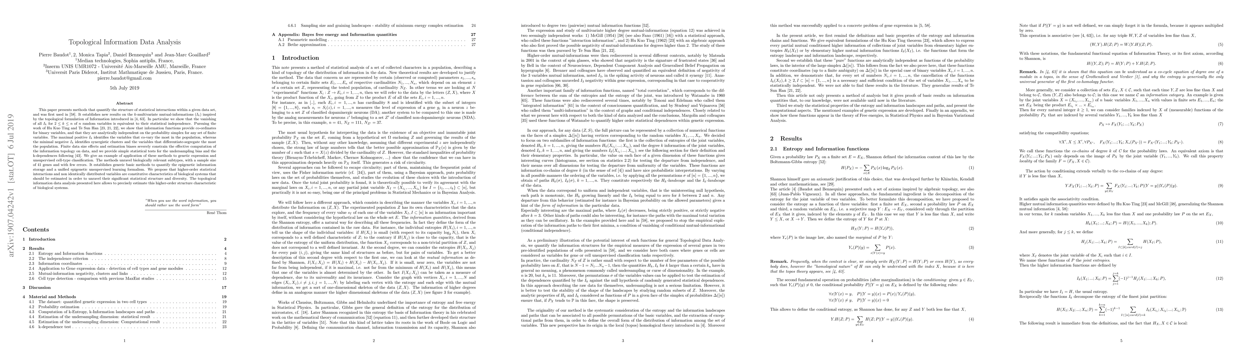 This paper presents methods that quantify the structure of statistical interactions within a given data set, and was first used in \cite{Tapia2018}. It establishes new results on the k-multivariate mutual-informations (I_k) inspired by the topological formulation of Information introduced in. In particular we show that the vanishing of all I_k for 2\leq k \leq n of n random variables is equivalent to their statistical independence. Pursuing the work of Hu Kuo Ting and Te Sun Han, we show that information functions provide co-ordinates for binary variables, and that they are analytically independent on the probability simplex for any set of finite variables. The maximal positive I_k identifies the variables that co-vary the most in the population, whereas the minimal negative I_k identifies synergistic clusters and the variables that differentiate-segregate the most the population. Finite data size effects and estimation biases severely constrain the effective computation of the information topology on data, and we provide simple statistical tests for the undersampling bias and the k-dependences following. We give an example of application of these methods to genetic expression and unsupervised cell-type classification. The methods unravel biologically relevant subtypes, with a sample size of 41 genes and with few errors. It establishes generic basic methods to quantify the epigenetic information storage and a unified epigenetic unsupervised learning formalism. We propose that higher-order statistical interactions and non identically distributed variables are constitutive characteristics of biological systems that should be estimated in order to unravel their significant statistical structure and diversity. The topological information data analysis presented here allows to precisely estimate this higher-order structure characteristic of biological systems.