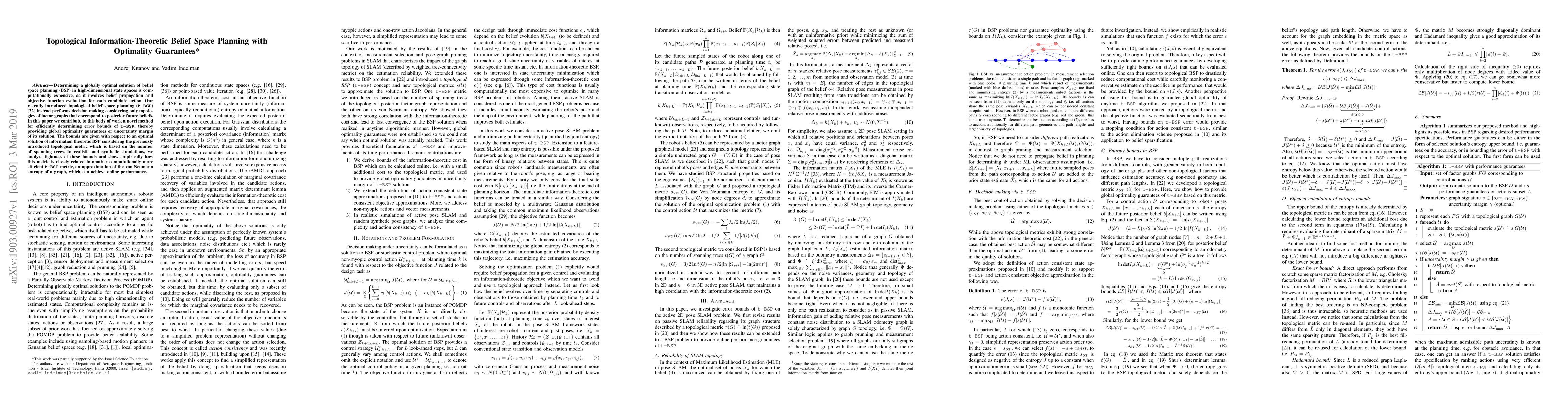 This paper introduces a novel method for efficiently determining error bounds in topological belief space planning (t-bsp), providing global optimality guarantees. It analyzes the tightness of these bounds in simulations and shows their relation to a more computationally efficient metric based on the von Neumann entropy of a graph.