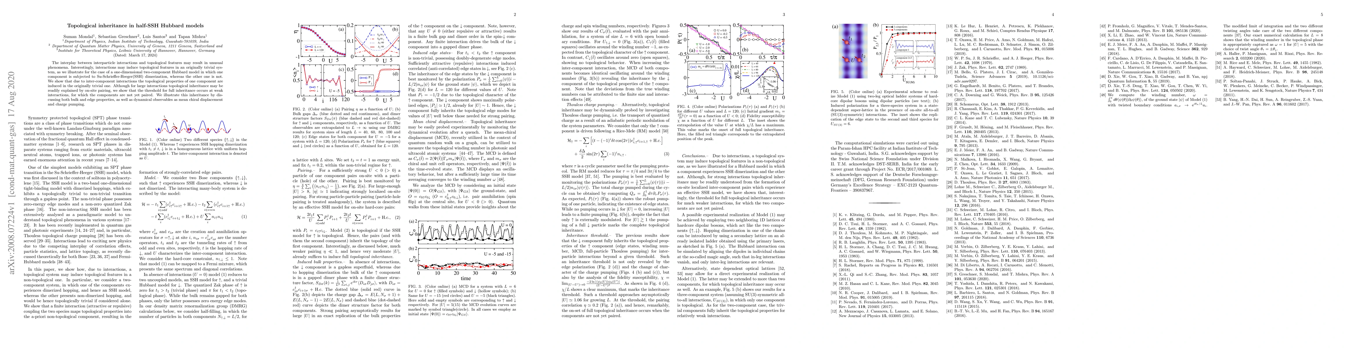 The interplay between interparticle interactions and topological features may result in unusual phenomena. Interestingly, interactions may induce topological features in an originally trivial system, as we illustrate for the case of a one-dimensional two-component Hubbard model in which one component is subjected to Su-Schrieffer-Heeger(SSH) dimerization, whereas the other one is not. We show that due to inter-component interactions the topological properties of one component are induced in the originally trivial one. Although for large interactions topological inheritance may be readily explained by on-site pairing, we show that the threshold for full inheritance occurs at weak interactions, for which the components are not yet paired. We illustrate this inheritance by discussing both bulk and edge properties, as well as dynamical observables as mean chiral displacement and charge pumping.