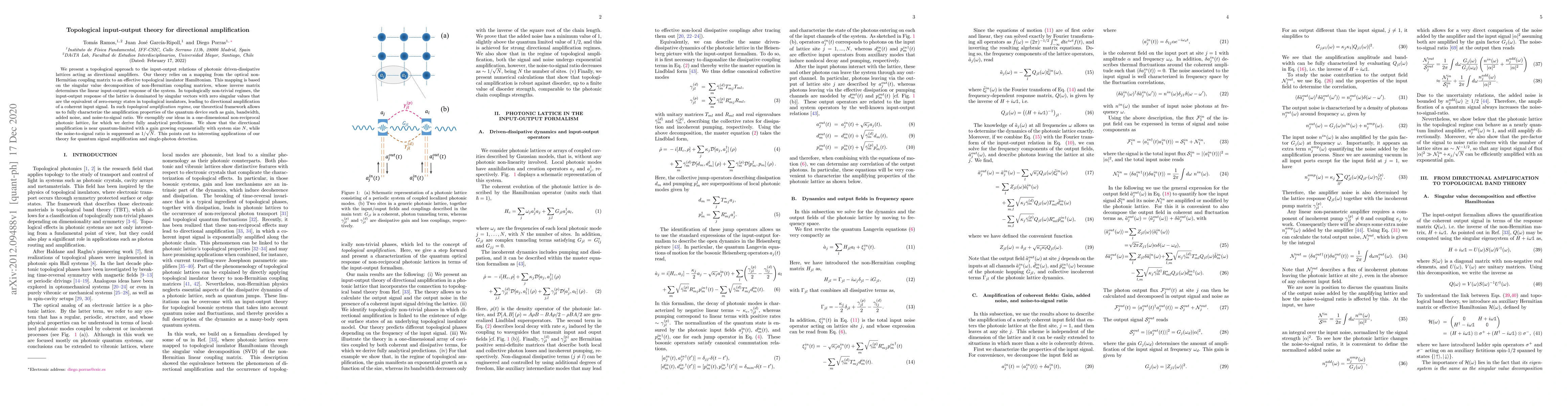We present a topological approach to the input-output relations of photonic driven-dissipative lattices acting as directional amplifiers. Our theory relies on a mapping from the optical non-Hermitian coupling matrix to an effective topological insulator Hamiltonian. This mapping is based on the singular value decomposition of non-Hermitian coupling matrices, whose inverse matrix determines the linear input-output response of the system. In topologically non-trivial regimes, the input-output response of the lattice is dominated by singular vectors with zero singular values that are the equivalent of zero-energy states in topological insulators, leading to directional amplification of a coherent input signal. In such topological amplification regime, our theoretical framework allows us to fully characterize the amplification properties of the quantum device such as gain, bandwidth, added noise, and noise-to-signal ratio. We exemplify our ideas in a one-dimensional non-reciprocal photonic lattice, for which we derive fully analytical predictions. We show that the directional amplification is near quantum-limited with a gain growing exponentially with system size, $N$, while the noise-to-signal ratio is suppressed as $1/\sqrt{N}$. This points out to interesting applications of our theory for quantum signal amplification and single-photon detection.