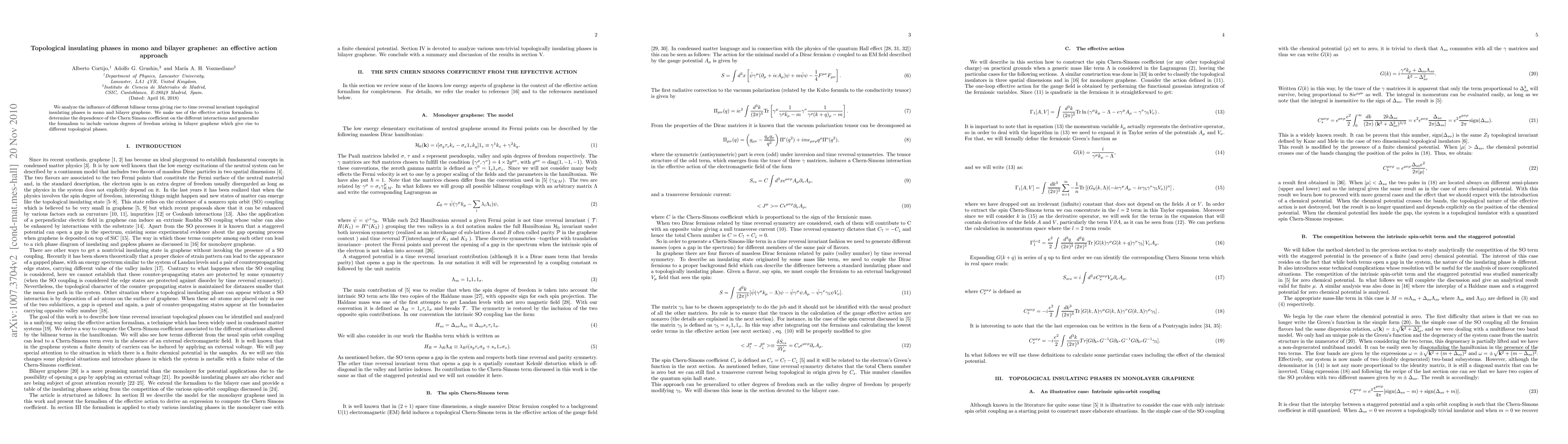 We analyze the influence of different quadratic interactions giving rise to time reversal invariant topological insulating phases in mono and bilayer graphene. We make use of the effective action formalism to determine the dependence of the Chern Simons coefficient on the different interactions.