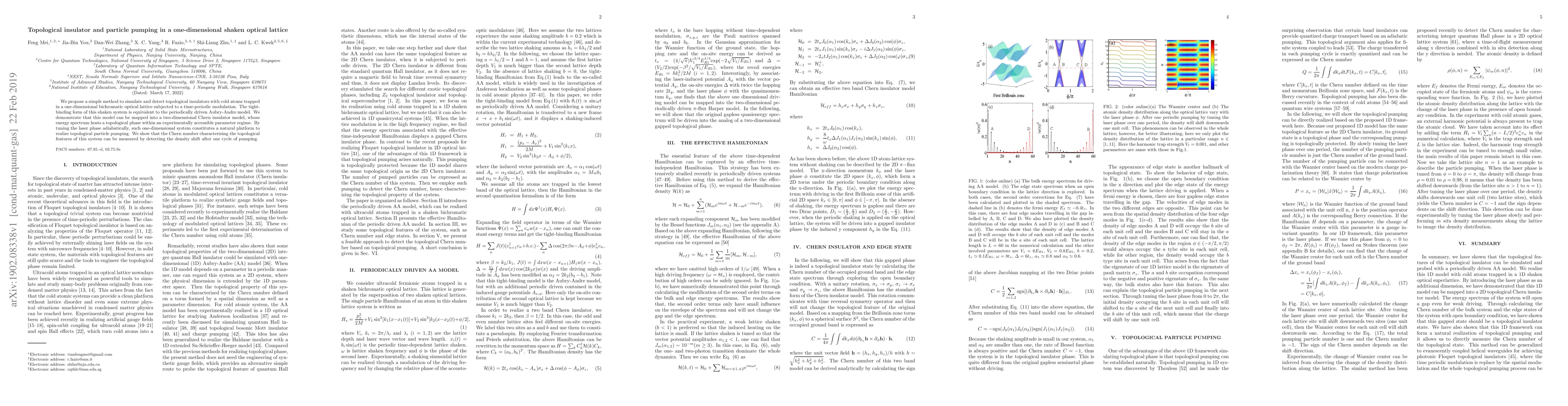 This paper proposes a method to simulate topological insulators using cold atoms in a one-dimensional bichromatic optical lattice subjected to time-periodic modulation, equivalent to the driven Aubry-Andre model. The system exhibits topological particle pumping, with the Chern number measurable via density shift after one pumping cycle.