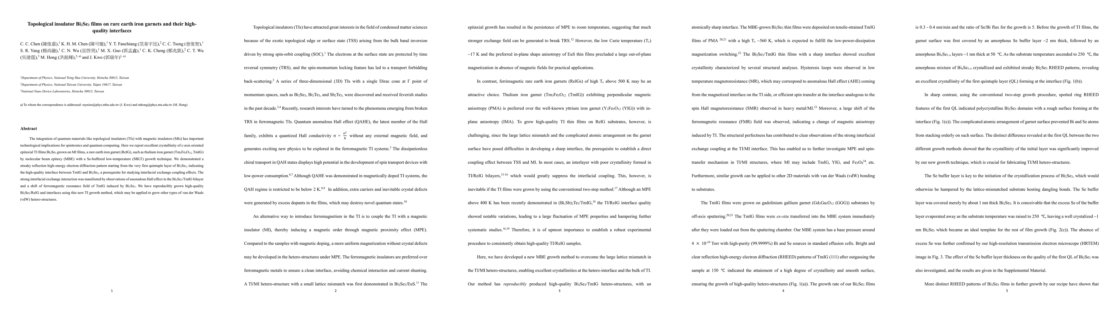 This paper reports the successful growth of high-quality, c-axis oriented epitaxial Bi2Se3 topological insulator films on rare earth iron garnet substrates via a novel molecular beam epitaxy technique, demonstrating excellent crystallinity and a high-quality interface essential for spintronics and quantum computing applications. The study also reveals strong interfacial exchange interactions evidenced by the anomalous Hall effect and shifts in the ferromagnetic resonance field.
