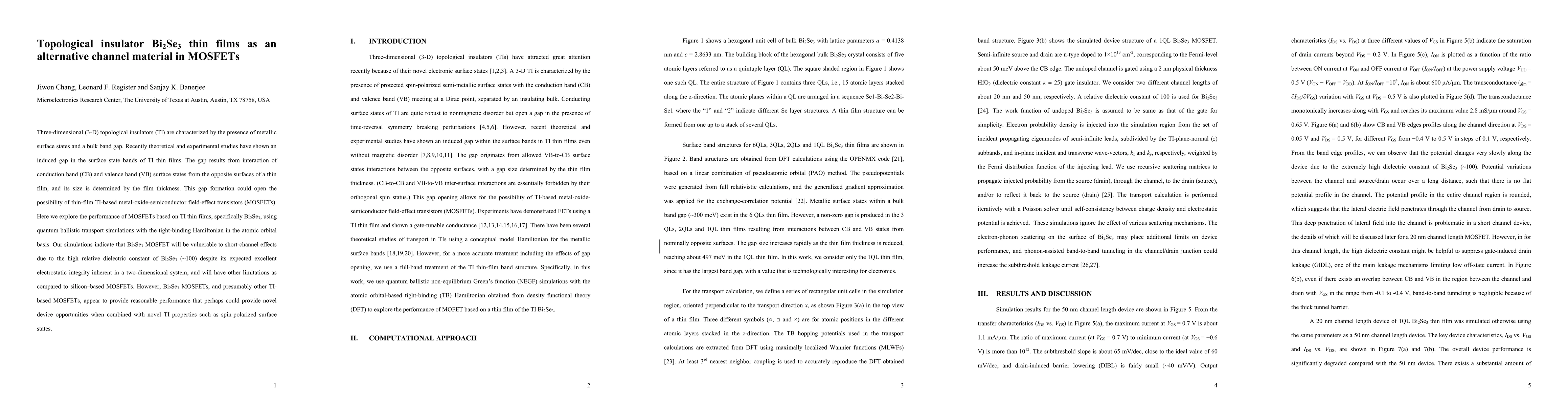This paper investigates the potential of Bi2Se3 thin films, a type of 3-D topological insulator, as an alternative channel material in MOSFETs. Simulations suggest that while Bi2Se3 MOSFETs show promise due to their unique properties, they face challenges like vulnerability to short-channel effects and limitations compared to silicon-based MOSFETs.