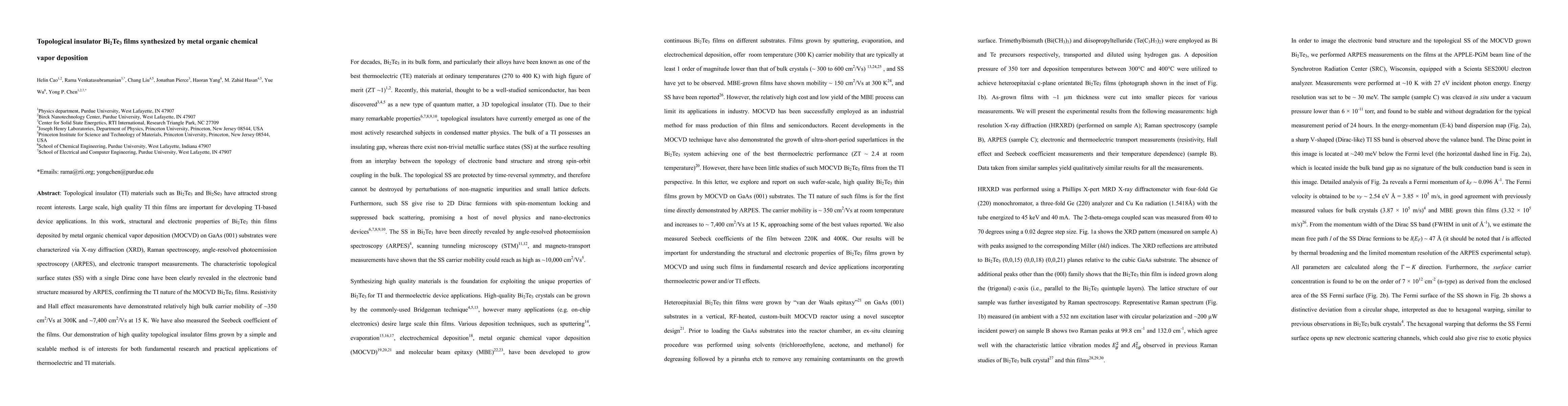 This paper reports the synthesis of high-quality Bi2Te3 topological insulator films via metal organic chemical vapor deposition (MOCVD) and their characterization using various techniques. The films exhibit topological surface states and demonstrate high bulk carrier mobility, indicating potential for thermoelectric and topological device applications.