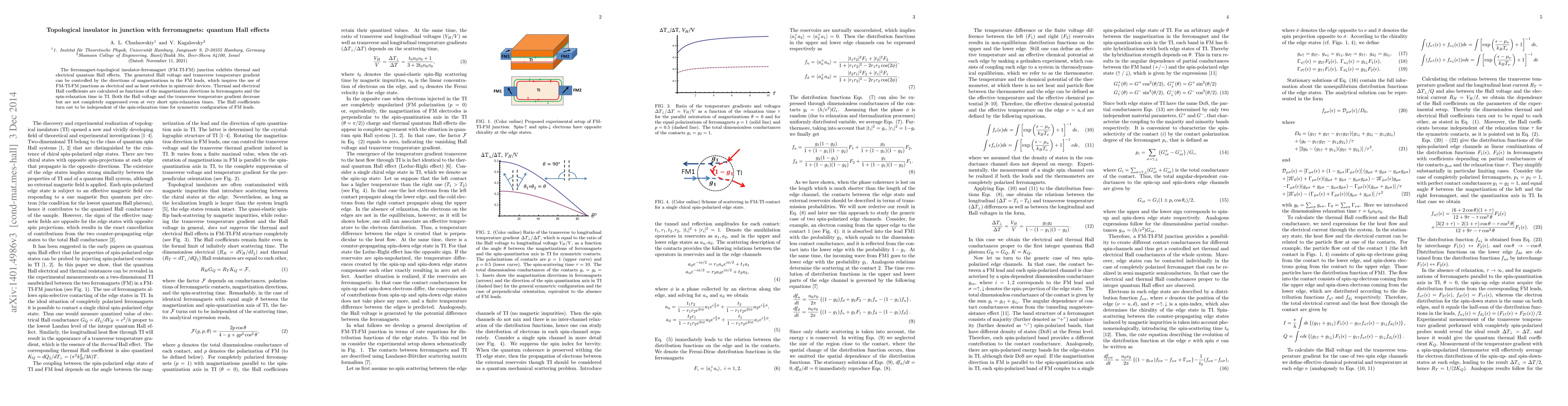 The FM-TI-FM junction demonstrates controllable thermal and electrical quantum Hall effects, with Hall voltage and temperature gradient influenced by ferromagnet magnetization directions. The Hall coefficients remain independent of spin-relaxation time in symmetric configurations, indicating potential for use in spintronic devices.