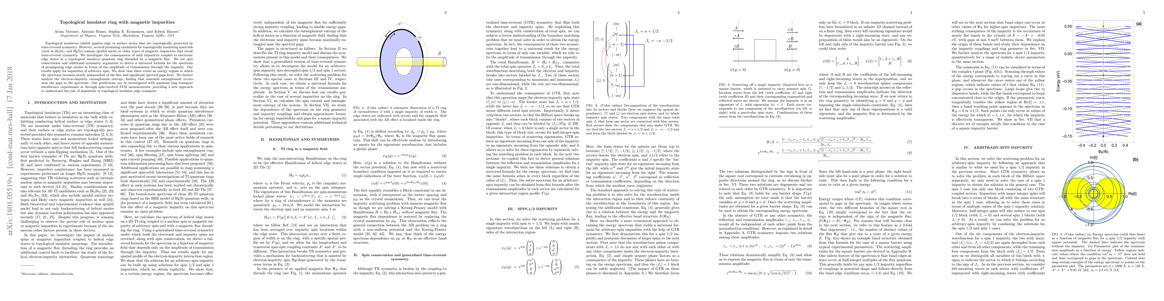 Topological insulators exhibit gapless edge or surface states that are topologically protected by time-reversal symmetry. However, several promising candidates for topologically insulating materials (such as Bi$_2$Se$_3$ and HgTe) contain spinful nuclei or other types of magnetic impurities that break time-reversal symmetry. We investigate the consequences of such impurities coupled to electronic edge states in a topological insulator quantum ring threaded by a magnetic flux. We use spin conservation and additional symmetry arguments to derive a universal formula for the spectrum of propagating edge modes in terms of the amplitude of transmission through the impurity. Our results apply for impurities of arbitrary spin. We show that there exists an energy regime in which the spectrum becomes nearly independent of the flux and significant spectral gaps form. We further analyze the electron-impurity entanglement entropy, finding that maximal entanglement occurs near the gaps in the spectrum. Our predictions can be investigated with quantum ring transport interference experiments or through spin-resolved STM measurements, providing a new approach to understand the role of impurities in topological insulator edge transport.