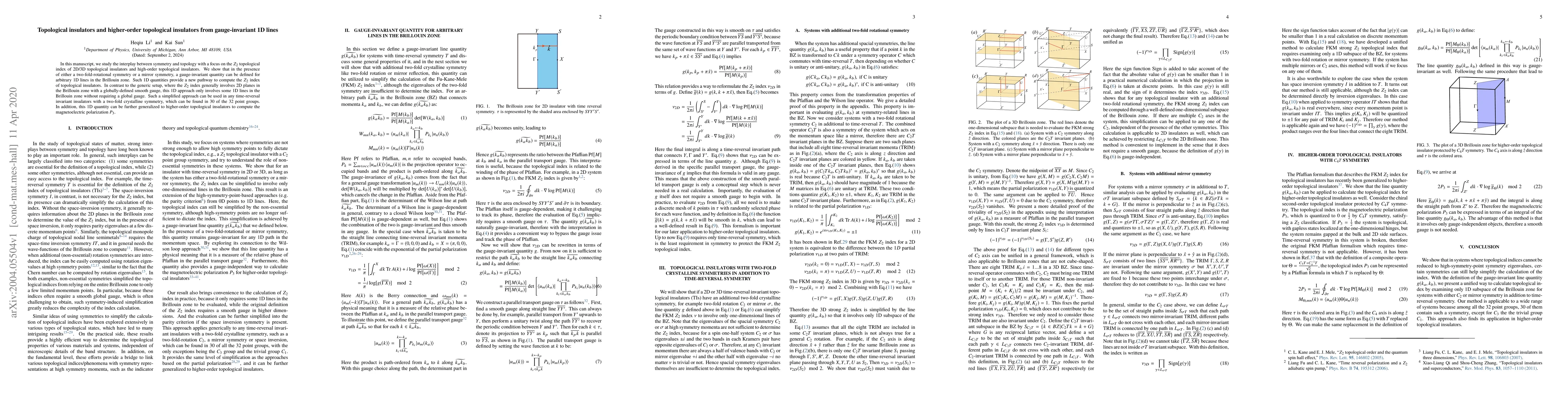 This paper explores the relationship between symmetry and topology in 2D/3D topological insulators, introducing a new method to compute the $Z_2$ topological index using gauge-invariant 1D lines in the Brillouin zone. This 1D approach simplifies the computation by avoiding the need for a global gauge, applicable to time-reversal invariant insulators with two-fold symmetry and extendable to higher-order topological insulators.